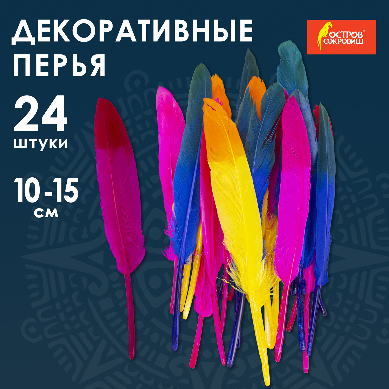 - Перья декоративные прямые, 10-15 см, 24 шт., 6 цветов, двухцветные, ассорти, ОСТРОВ СОКРОВИЩ, 661381