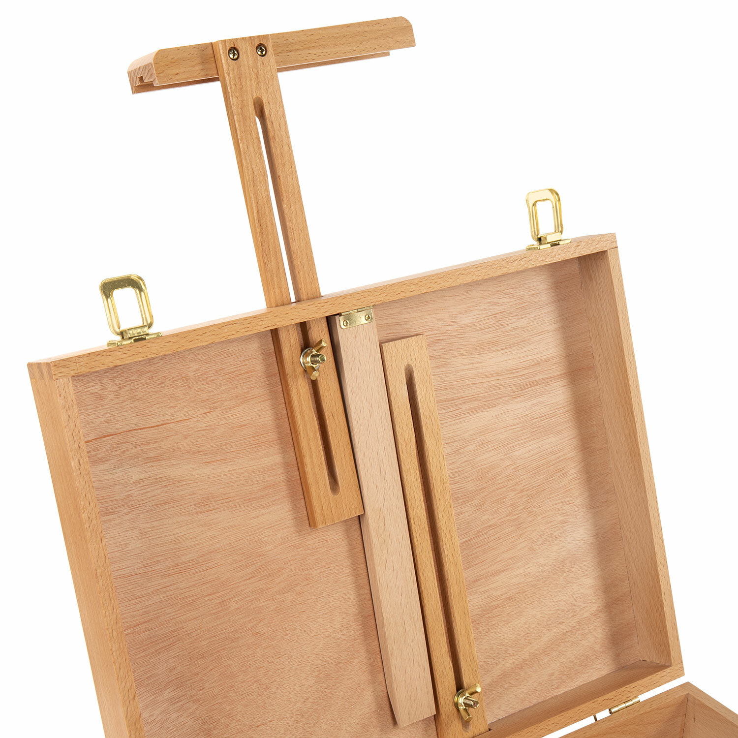 Настольный этюдник-мольберт изготовлен из натурального бука, пропитанного маслом. Этюдник снабжен специальным ящиком для художественных принадлежностей. Угол наклона и высота мачты регулируется. Оснащен удобной ручкой. Глубина полки - 2 см, ширина полки – 18 см. Максимальная высота холста – 45 см. Размер в рабочем виде – 38х28х55 см. Размер основания – 40х30 см. Вес – 1,9 кг.