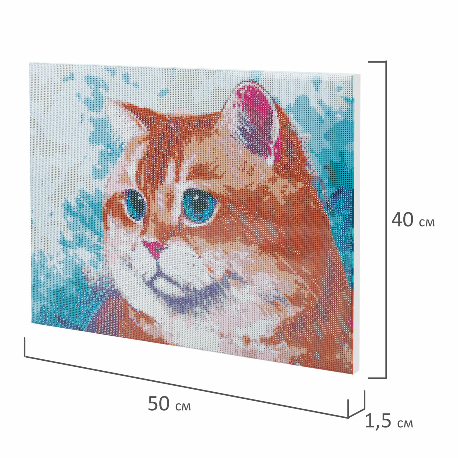 Размер готовой картины составляет 40х50 см. Картина полностью заполняется квадратными акриловыми стразами, благодаря чему готовая работа блистает и переливается на свету.
