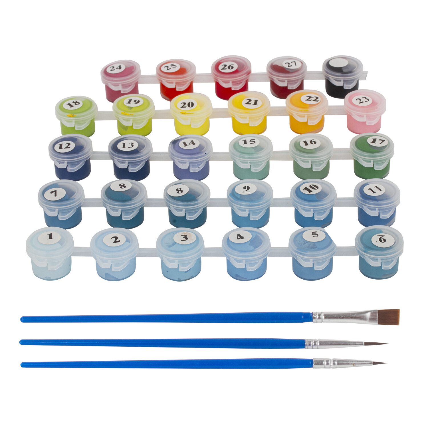 В набор входит: 1 хлопковый холст на подрамнике с контуром, 1 лист бумаги для тренировки, 28 акриловых красок объемом 3 мл каждая, 3 синтетические кисти и комплект металлических креплений для подвешивания на стену.