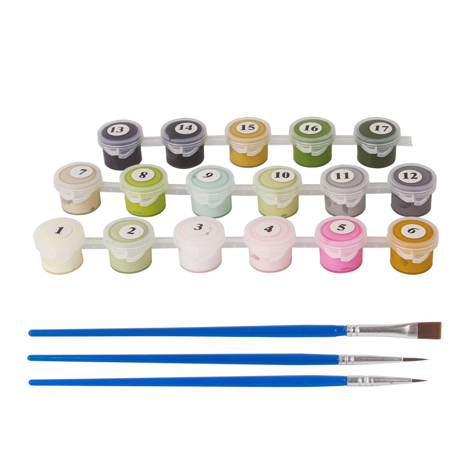 В набор входит: 1 хлопковый холст на подрамнике с контуром, 1 лист бумаги для тренировки, 17 акриловых красок объемом 3 мл каждая, 3 синтетические кисти и комплект металлических креплений для подвешивания на стену.