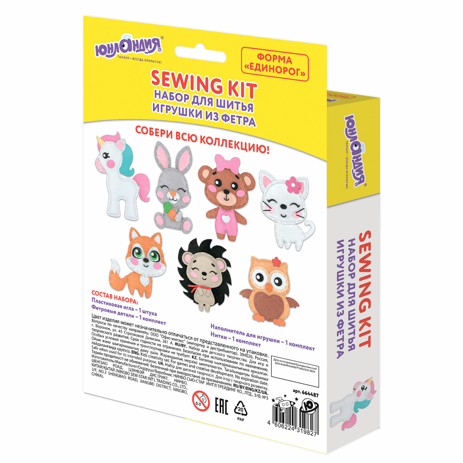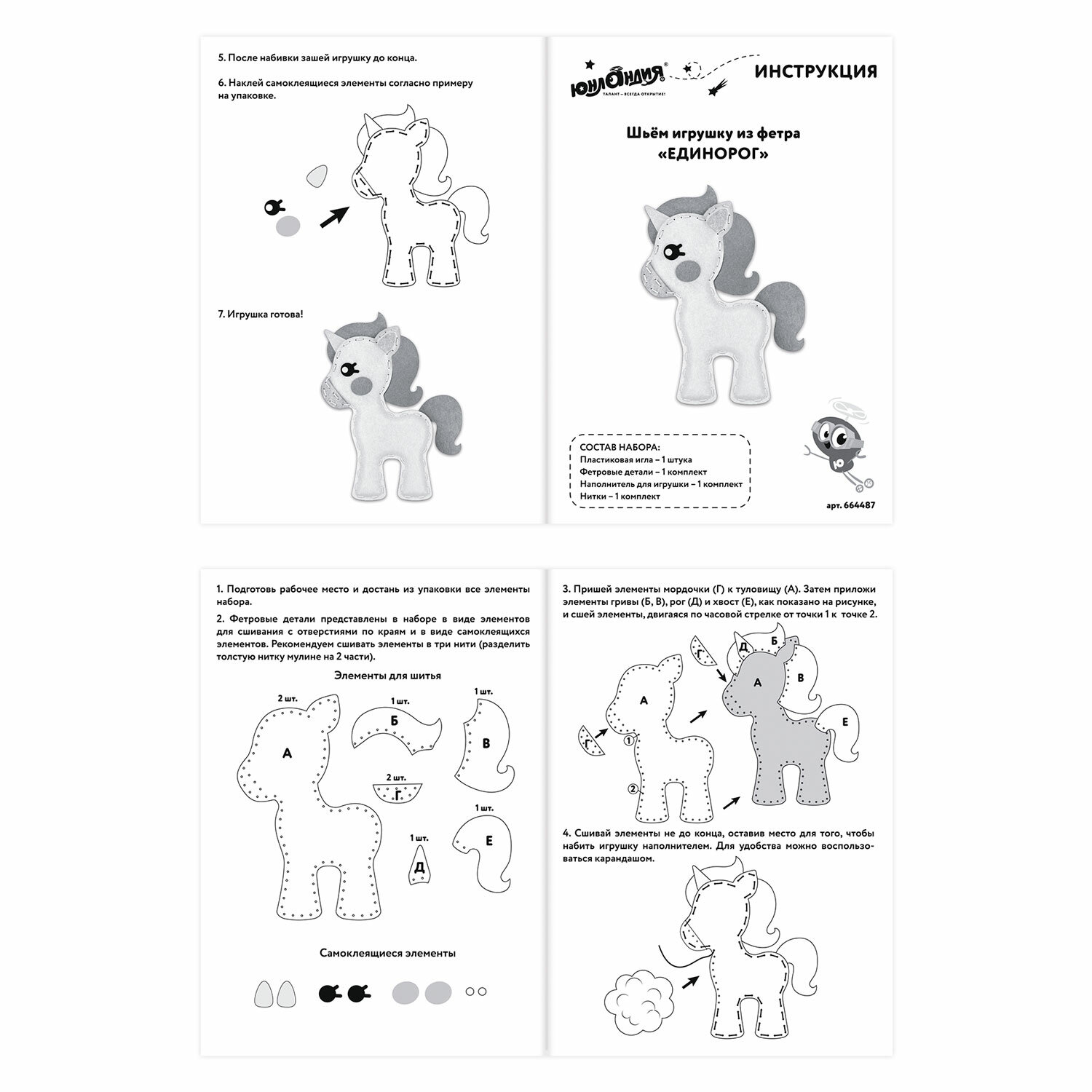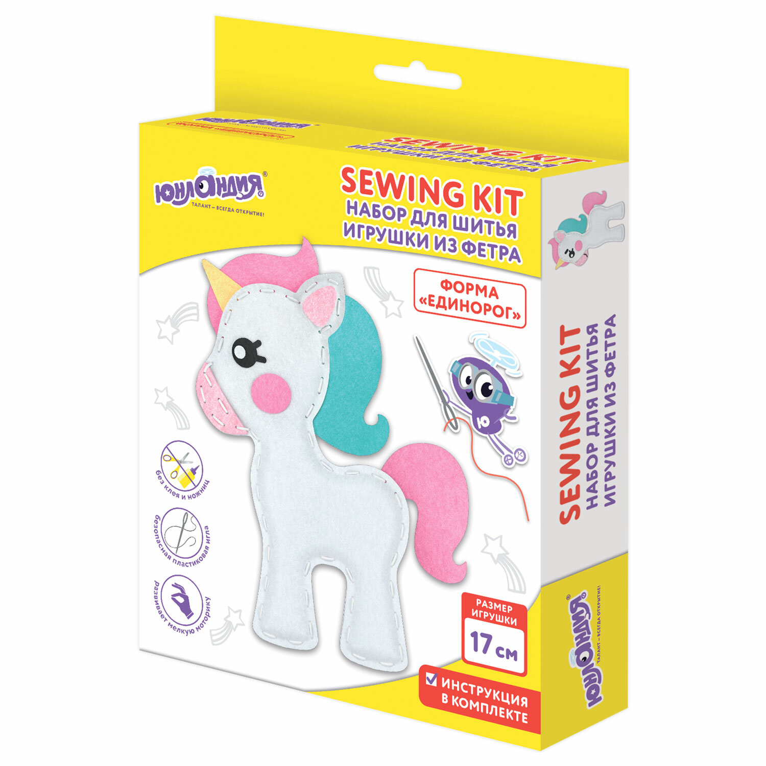 Набор способствует развитию мелкой моторики, внимательности, усидчивости, аккуратности, а готовая игрушка, созданная своими руками, будет долго радовать ребенка. Набор для шитья игрушки из фетра "Единорог", ЮНЛАНДИЯ, 664487