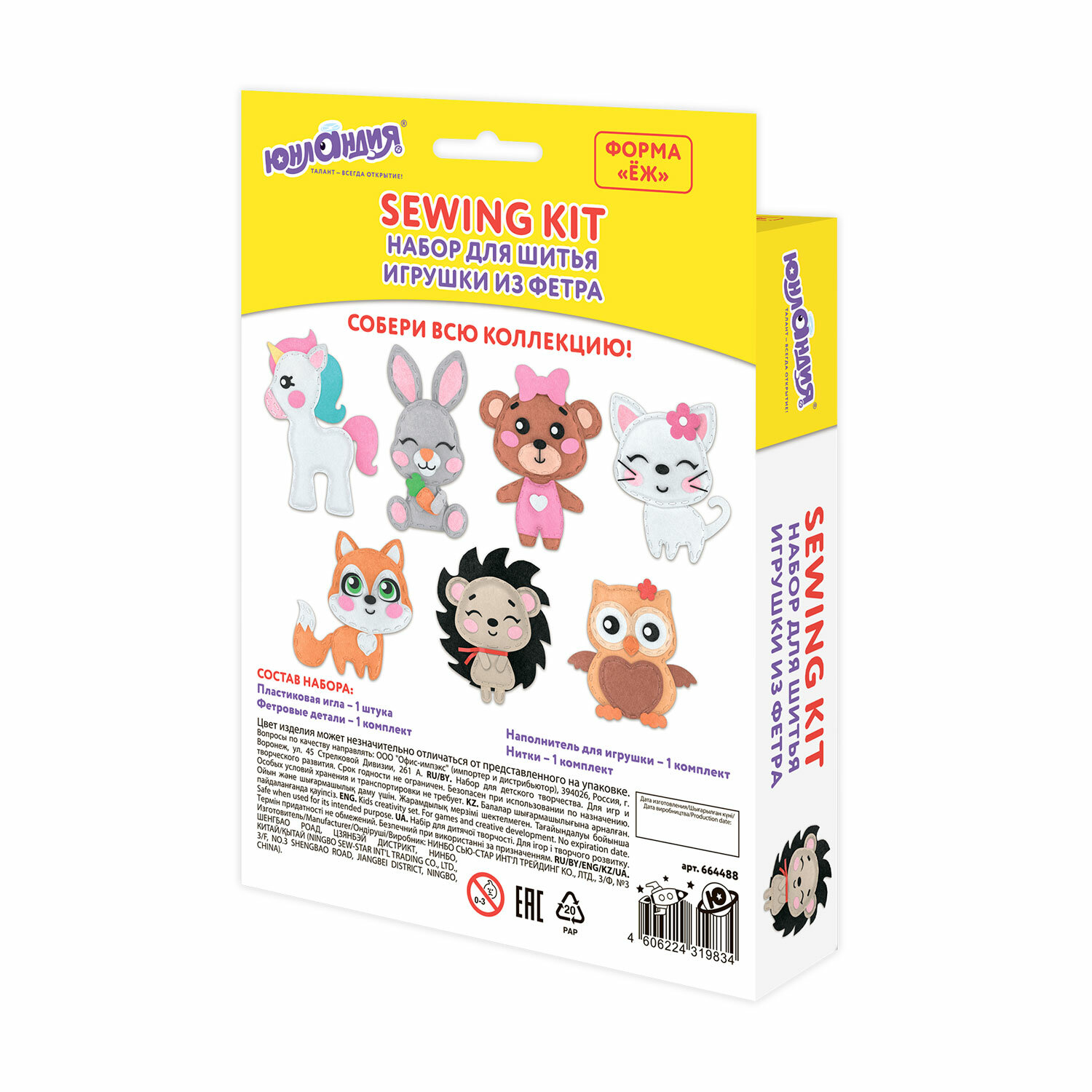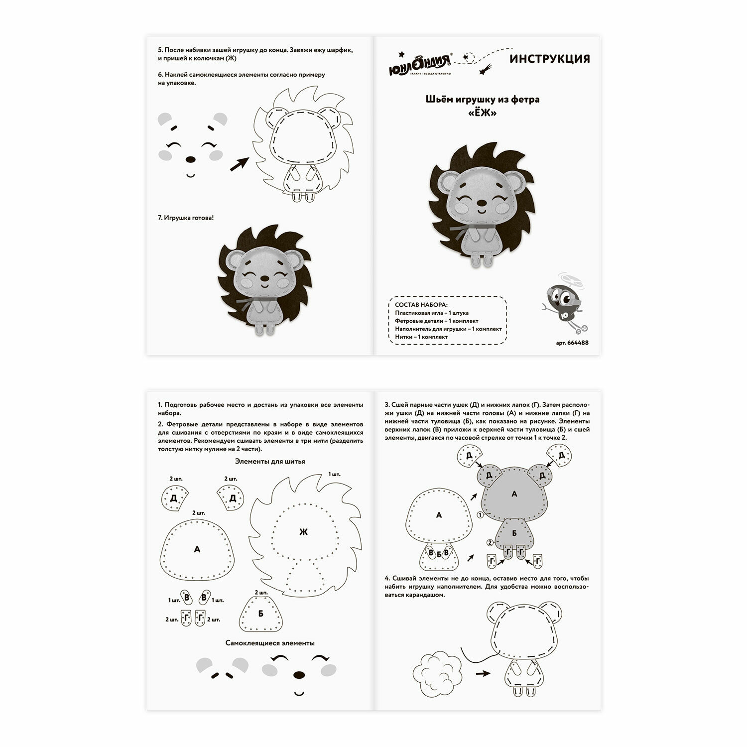 - Набор для шитья игрушки из фетра "Ёжик", ЮНЛАНДИЯ, 664488