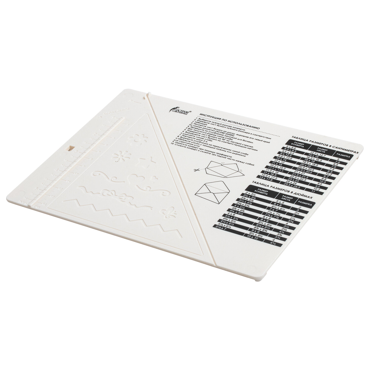 В набор входит прочная доска для биговки из АБС-пластика размером 16х21,5 см с разметкой в сантиметрах и дюймах, дырокол для скругления угла и создания выемок, палочка для биговки, трафарет для тиснения и подробная инструкция на обратной стороне доски. Доска для биговки МАЛАЯ 16х21,5 см и дырокол угла, НАБОР, ОСТРОВ СОКРОВИЩ, 662780