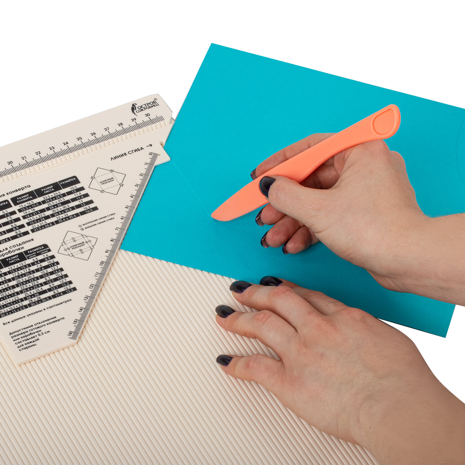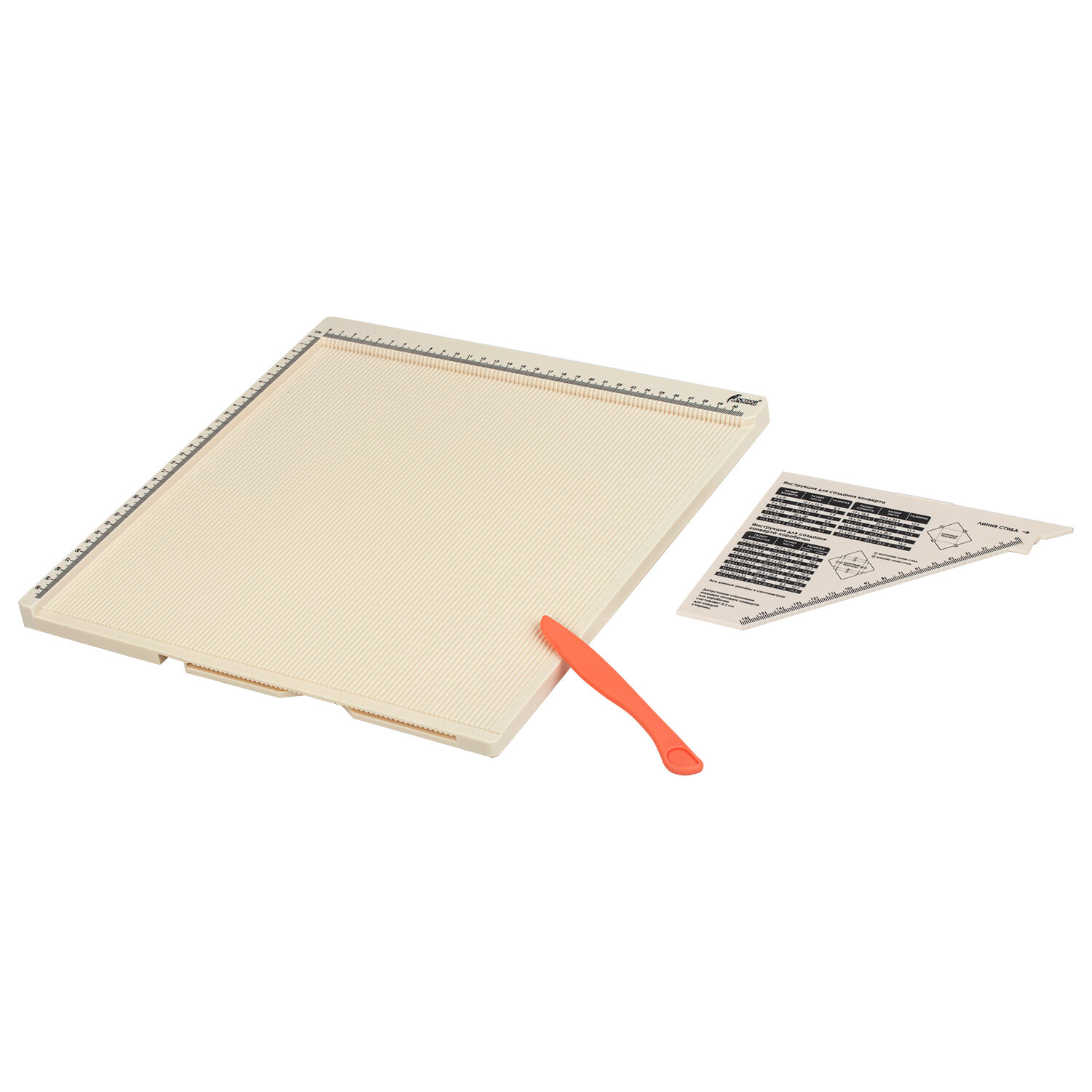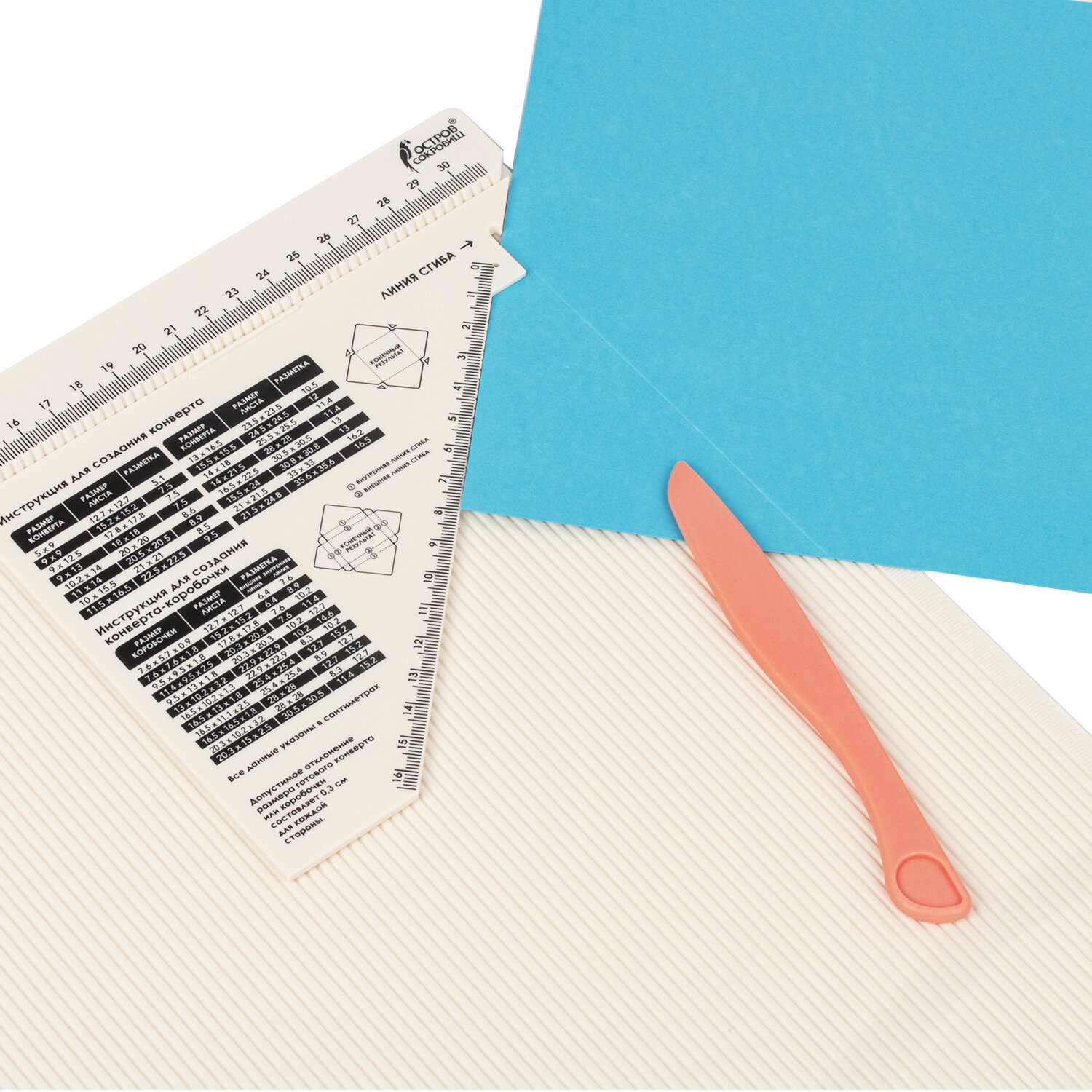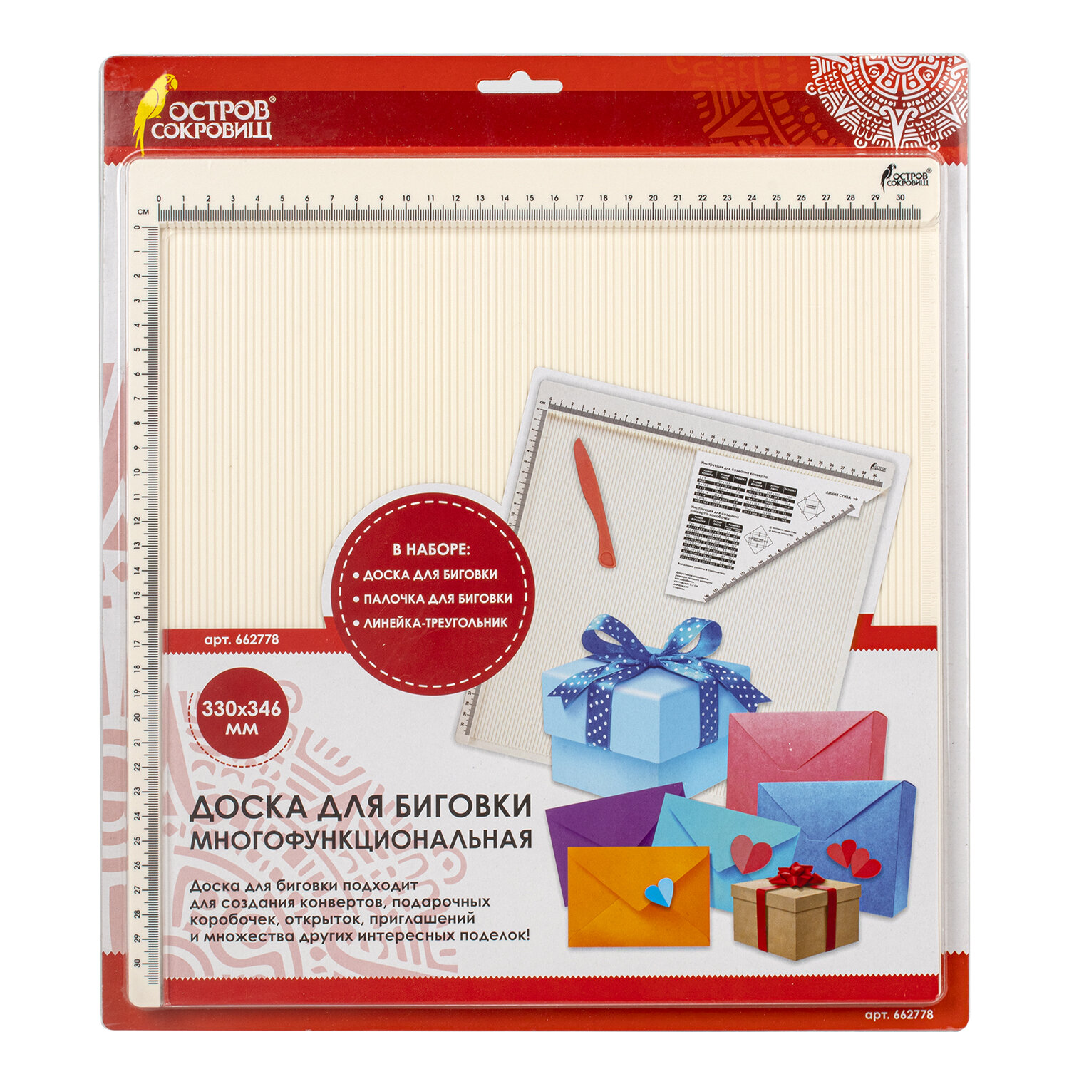 В набор входит прочная доска для биговки из АБС-пластика размером 33х34,6 см (размер рабочей поверхности составляет 30,5х30,5 см) с разметкой в сантиметрах, линейка-треугольник с инструкцией, палочка для биговки размером 14,5 см, а также подробная инструкция с понятными картинками на обратной стороне упаковки. Доска для биговки многофункциональная БОЛЬШАЯ 33х34,6 см, ОСТРОВ СОКРОВИЩ, 662778