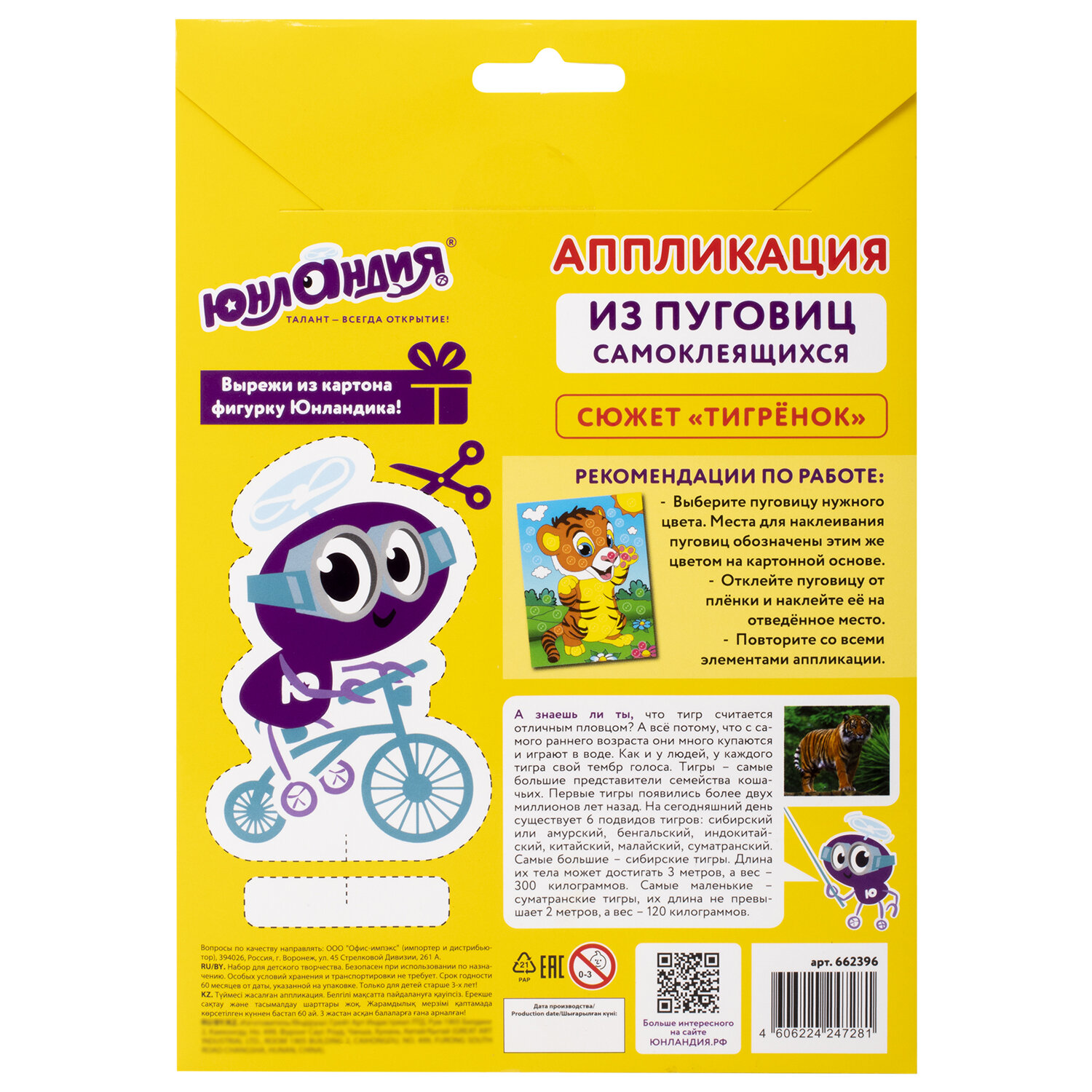 Набор упакован в красочный картонный конверт с европодвесом. На обратной стороне конверта вас ждёт сюрприз - фигурка Юнландика с подставкой. Покупая разные аппликации, можно собрать целую коллекцию забавных Юнландиков! Набор для творчества "Аппликация из пуговиц", "Тигрёнок", основа 20х15 см, ЮНЛАНДИЯ, 662396
