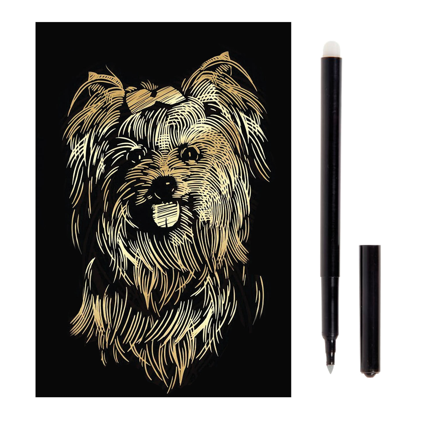 Гравюра - особый вид графического искусства. Сцарапывая верхний слой гравюры специальным штихелем, входящим в набор, ребёнок может самостоятельно создать настоящее произведение искусства и почувствовать себя гравером. Эта работа требует усидчивости, внимательности, аккуратности, а также развивает кисть, координацию движений. Гравюра с эффектом золота малая "Йоркширский терьер", 10х15 см, основа, штихель, LORI, Гр-218