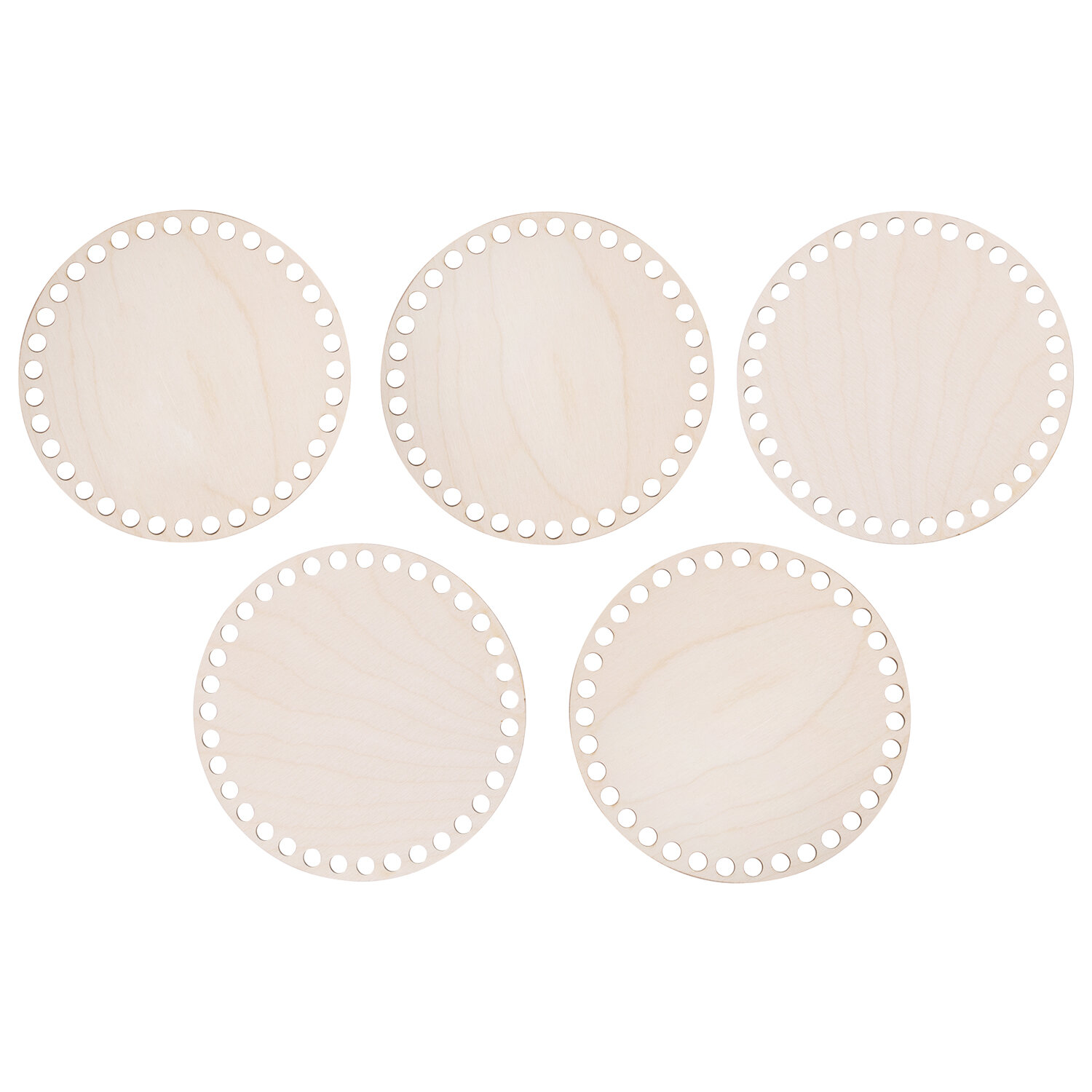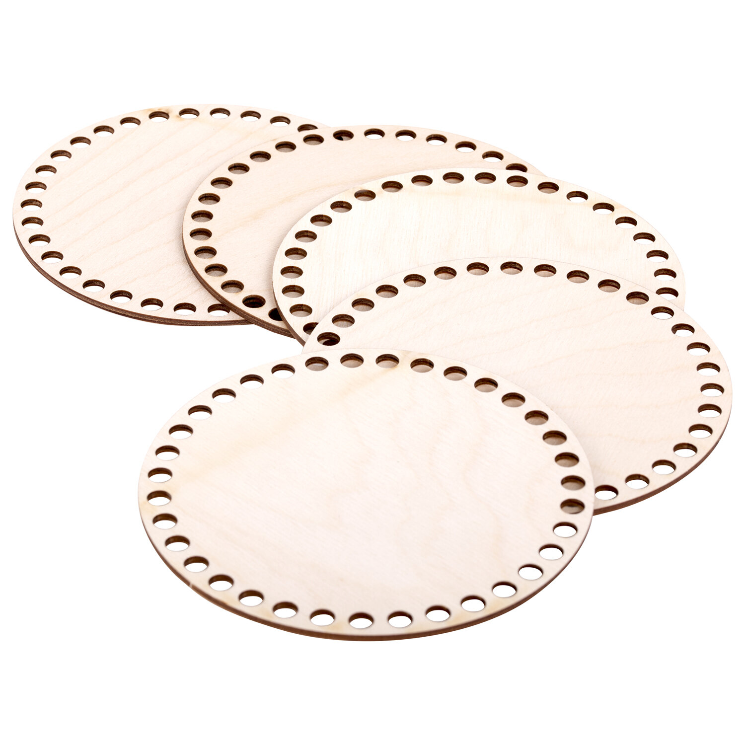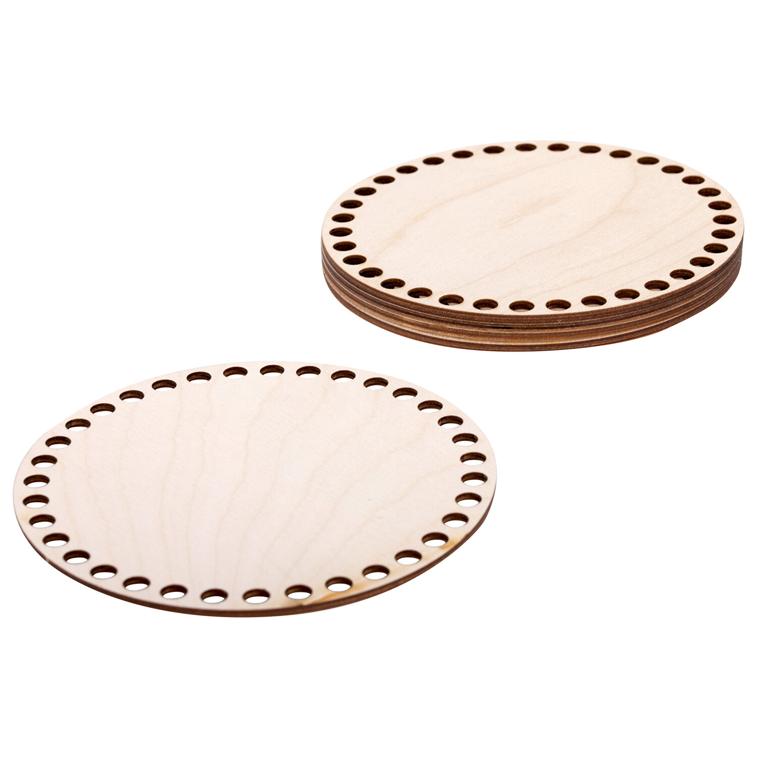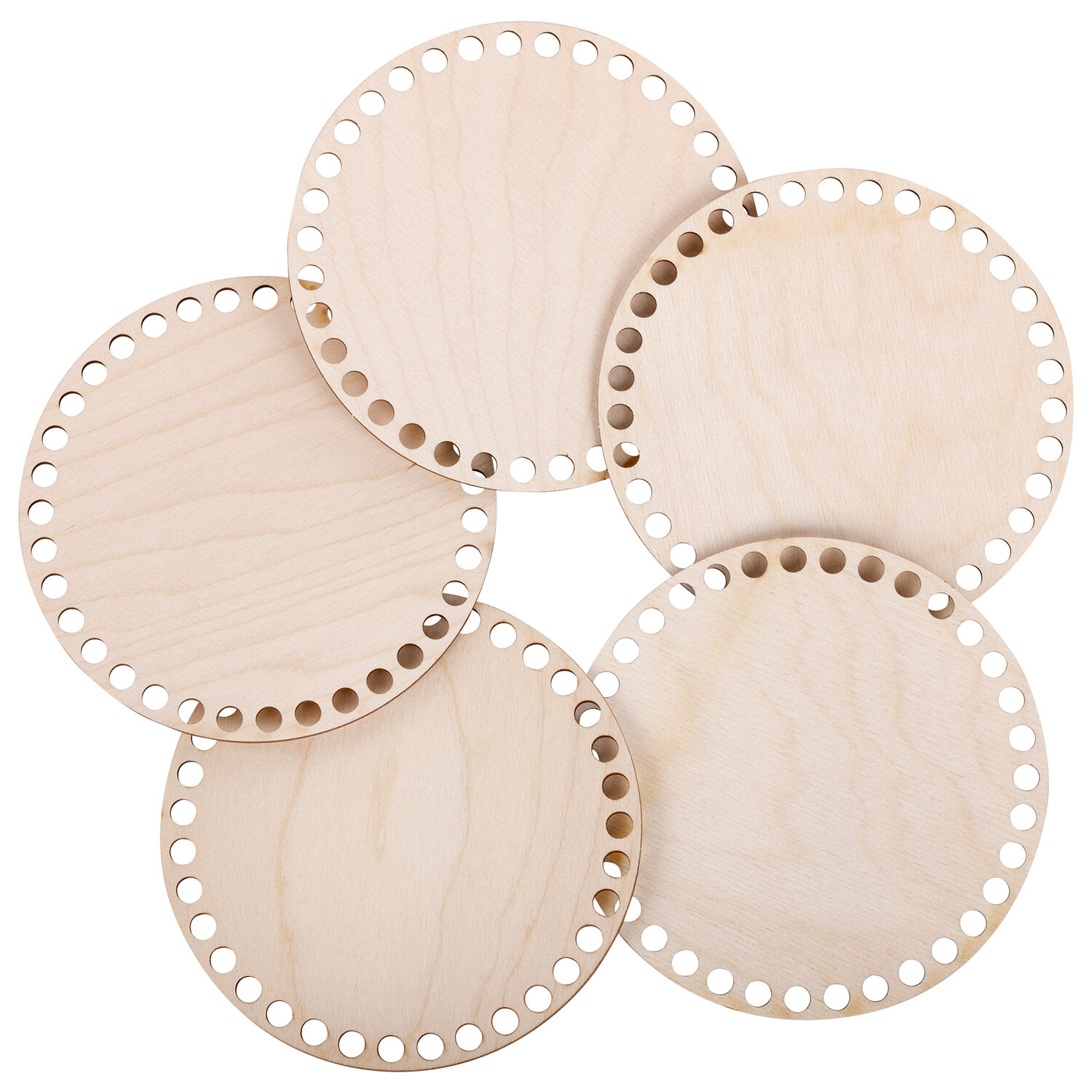 Комплект донышек – это прочный, устойчивый круглый каркас для вязания своими руками, способствующий экономии пряжи. Основа подходит для плетения из шнура, толстых и тонких трикотажных нитей или джута. Заготовки выполнены из березовой фанеры - материала из дерева высшего сорта, по краям набора равномерно распределены отверстия без зазубрин и скосов.