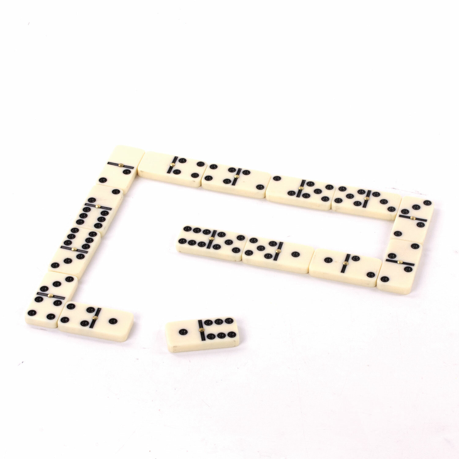 Настольная игра t;Доминоt; – это современный вариант классической игры домино. В наборе 28 пластиковых костяшки белого цвета с черными точками, обозначающими комбинации чисел на двух полях. Размер костяшек – 48,5х24х7,8 мм.