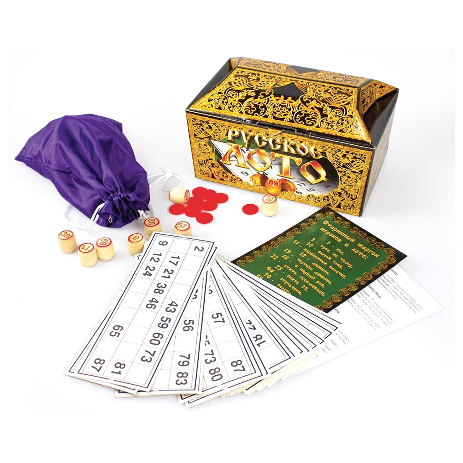 - Игра настольная "Русское лото" в картонном ларце, 90 бочонков, жетоны, 24 карточки, 10 КОРОЛЕВСТВО, 00142