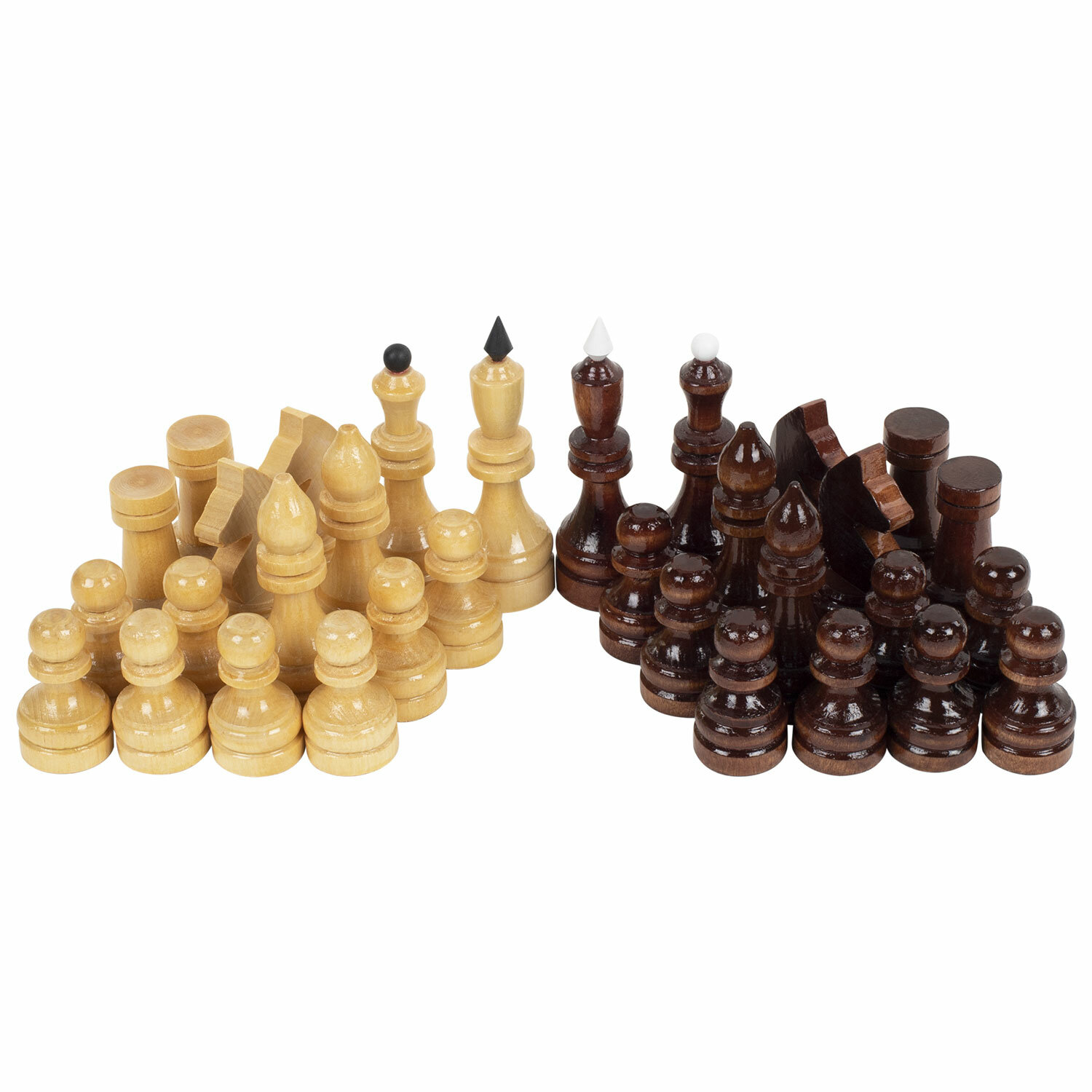 • Шахматные фигуры из хвойных и лиственных пород дерева (32 штуки): 16 светлых и 16 темных, с защитным лаковым покрытием.