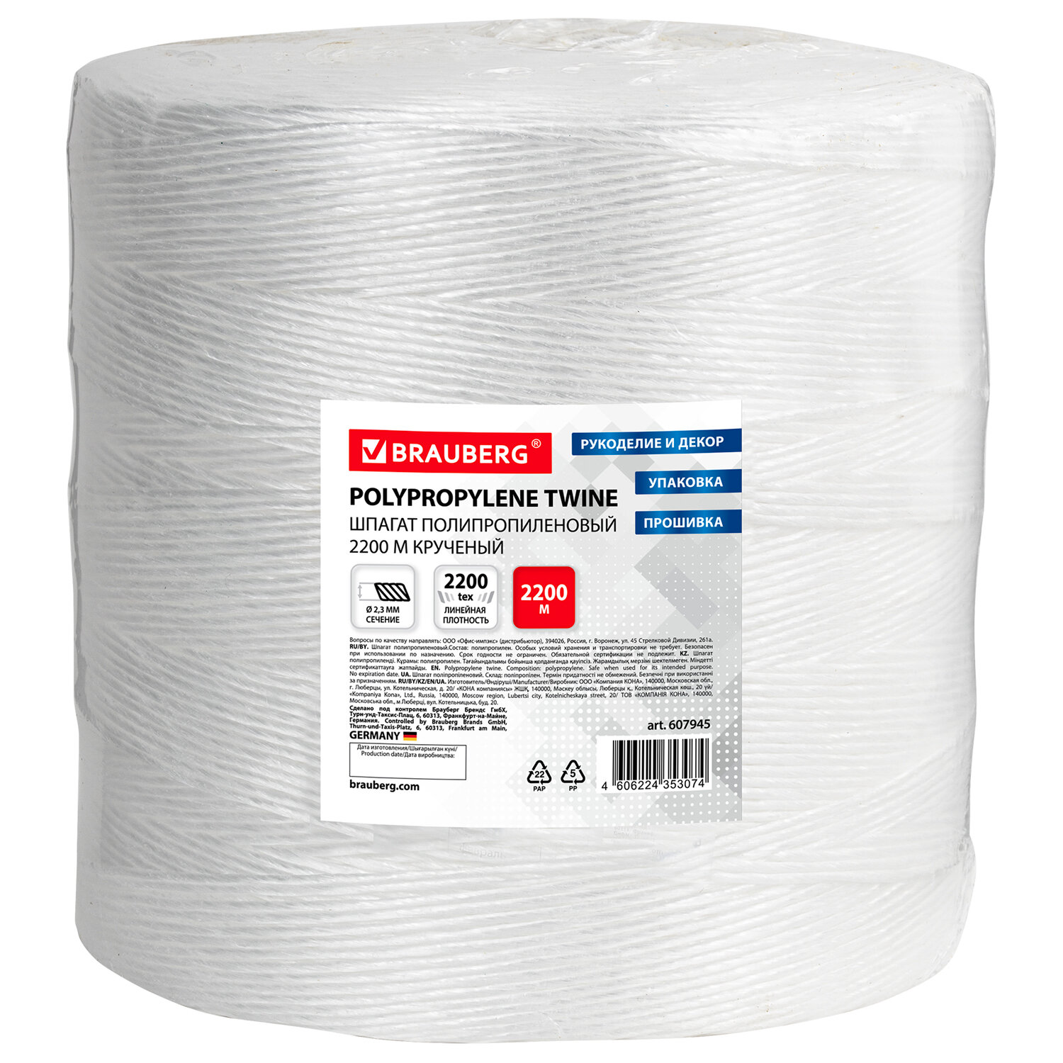 Изготовлен из первичного полипропиленового волокна методом скручивания нескольких волокон. Полипропиленовый шпагат легко вяжется в узлы, устойчив к истиранию, разрывам и растяжениям, обладает влагостойкостью, не подвержен гниению и поражению плесенью. В делопроизводстве шпагат активно используется для обвязки и прошивки документов, в быту - для упаковки товаров, подвязки растений и деревьев. Также полипропиленовый шпагат широко применяется в рукоделии для вязания сумок, салфеток, корзинок, ковриков и изготовления прочих декоративных изделий. Длина шпагата - 2200 м, диаметр нити - 2,3 мм, линейная плотность 2200 текс. Каждая бобина упакована в термоусадочную пленку. Шпагат полипропиленовый крученый длина 2200 м, диаметр 2,3 мм, BRAUBERG, 607945