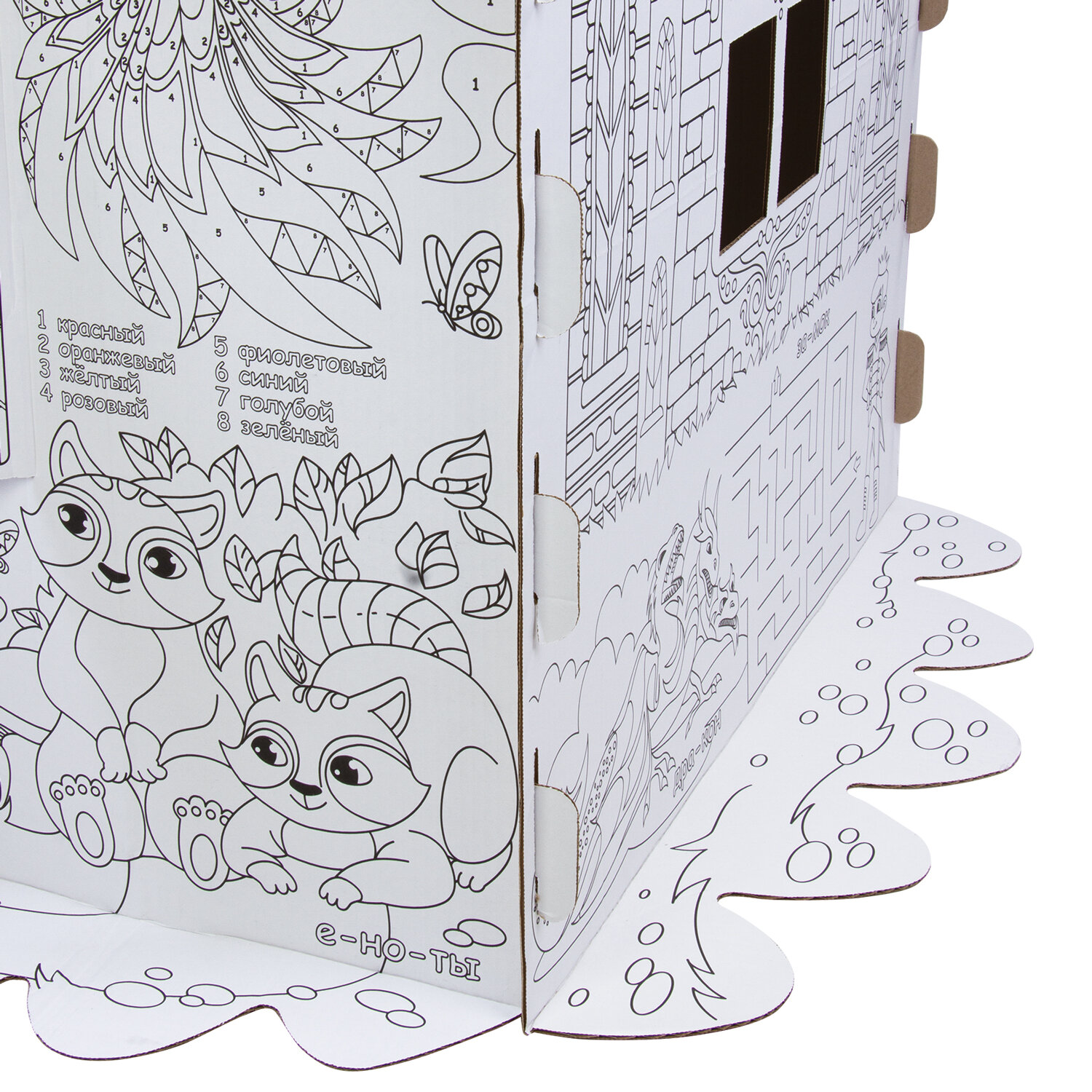 Домик-раскраска изготовлен из 100% безопасного, экологически чистого материала - гофрированного картона. Состоит из 7 деталей: 4-х стен, крыши, трубы и флюгера, которые очень просто собираются и крепятся между собой без клея и ножниц. Все стороны домика разные по дизайну, толстый контур у рисунков поможет малышу аккуратно их раскрасить любыми фломастерами, красками, карандашами, восковыми мелками. Полянка вокруг домика не даст испачкать ковер или пол красками. Все края домика имеют закругленную форму и безопасны для ребенка.