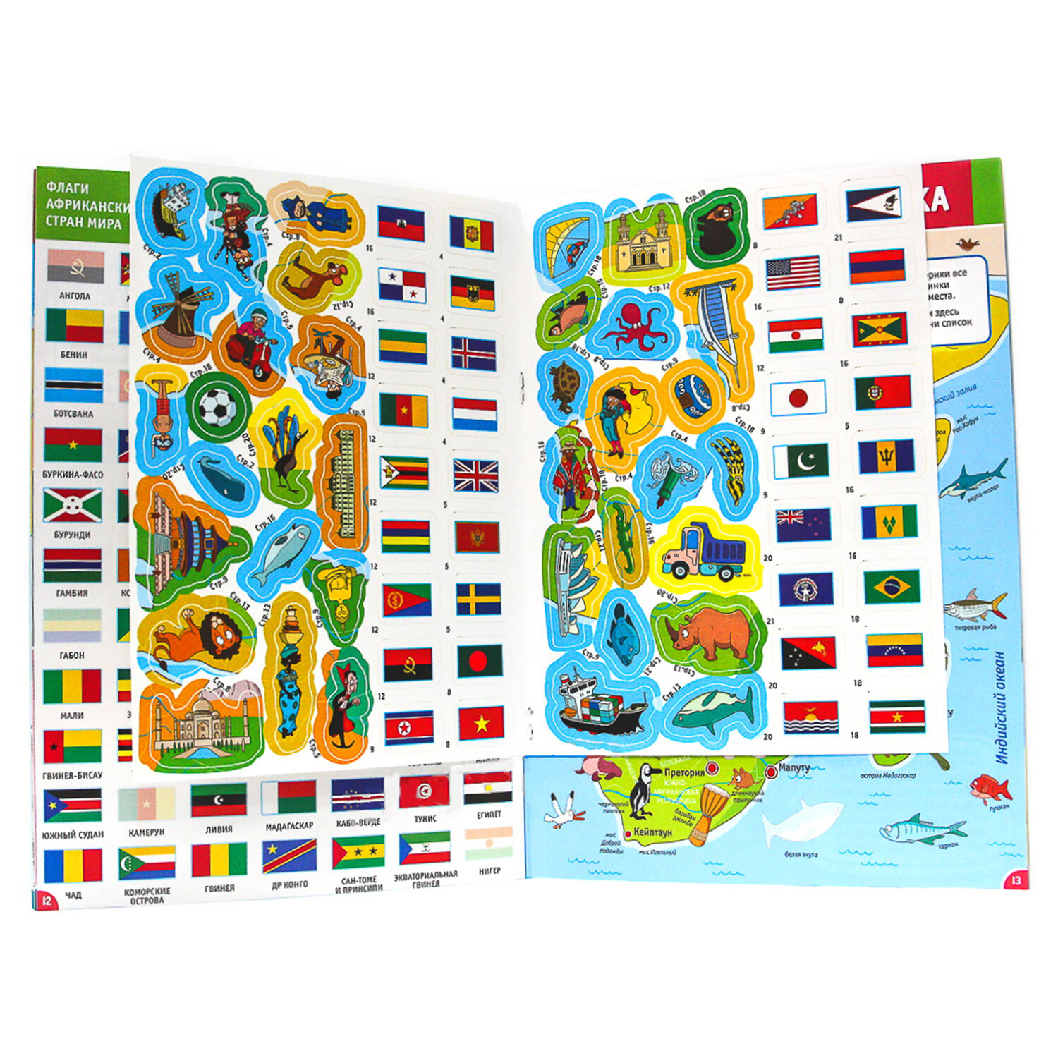 - Книжка-пособие АТЛАС МИРА. ФЛАГИ И СТРАНЫ, 195х275 мм, 24 стр. + 2 стр. наклеек, ПП, 1853-7