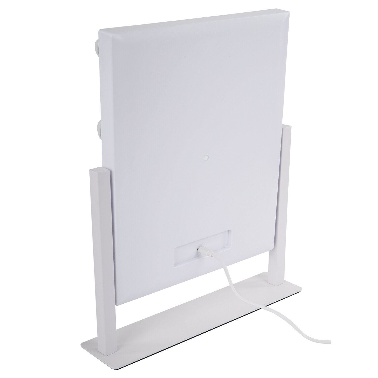 Зеркало в пластиковой рамке с устойчивой подставкой. Шарнирное соединение обеспечивает плавный поворот на 360° и настройку угла наклона.