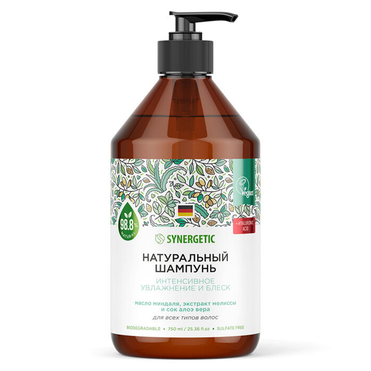 Состав: Aqua; Lauryl Glucoside; Sodium Lauroyl Methyl Isethionate; Cocamidopropyl Betaine; Candida Bombicola/Glucose/Methyl Rapeseedate Ferment; Lauroyl/Myristoyl Methyl Glucamide; Sweet Almond Oil Polyglyceryl-4 Esters (масло миндаля); Argan Oil Polyglyceryl-4 Esters (масло арганы); Cannabis Sativa Seed Oil Polyglyceryl-4 Esters (масло конопли); Aloe Barbadensis Leaf Juice (сок алоэ вера); Melissa officinalis Flower/Leaf/Stem Extract (экстракт мелиссы); Glycerin; Coco Glucoside; Glyceryl Oleate; Sodium Cocoyl Isethionate; Triticum Vulgare (Wheat) Protein (протеины пшеницы); Hyaluronic Acid (гиалуроновая кислота); Hydroxypropylgluconamide; Hydroxypropylammonium Gluconate; Glycol Distearate; Glyceryl Stearate; Guar Hydroxypropyltrimonium Chloride; Sodium Benzoate; Potassium Sorbate; Parfum; Tetrasodium Glutamate Diacetate; Sodium Citrate. Подтвержденный ECOCERT. Шампунь 750 мл, SYNERGETIC "Интенсивное увлажнение и блеск", бессульфатный, 701750