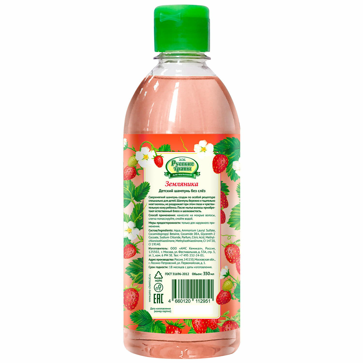 - Шампунь детский 350 мл, РУССКИЕ ТРАВЫ "Земляника", без слез, К12-7