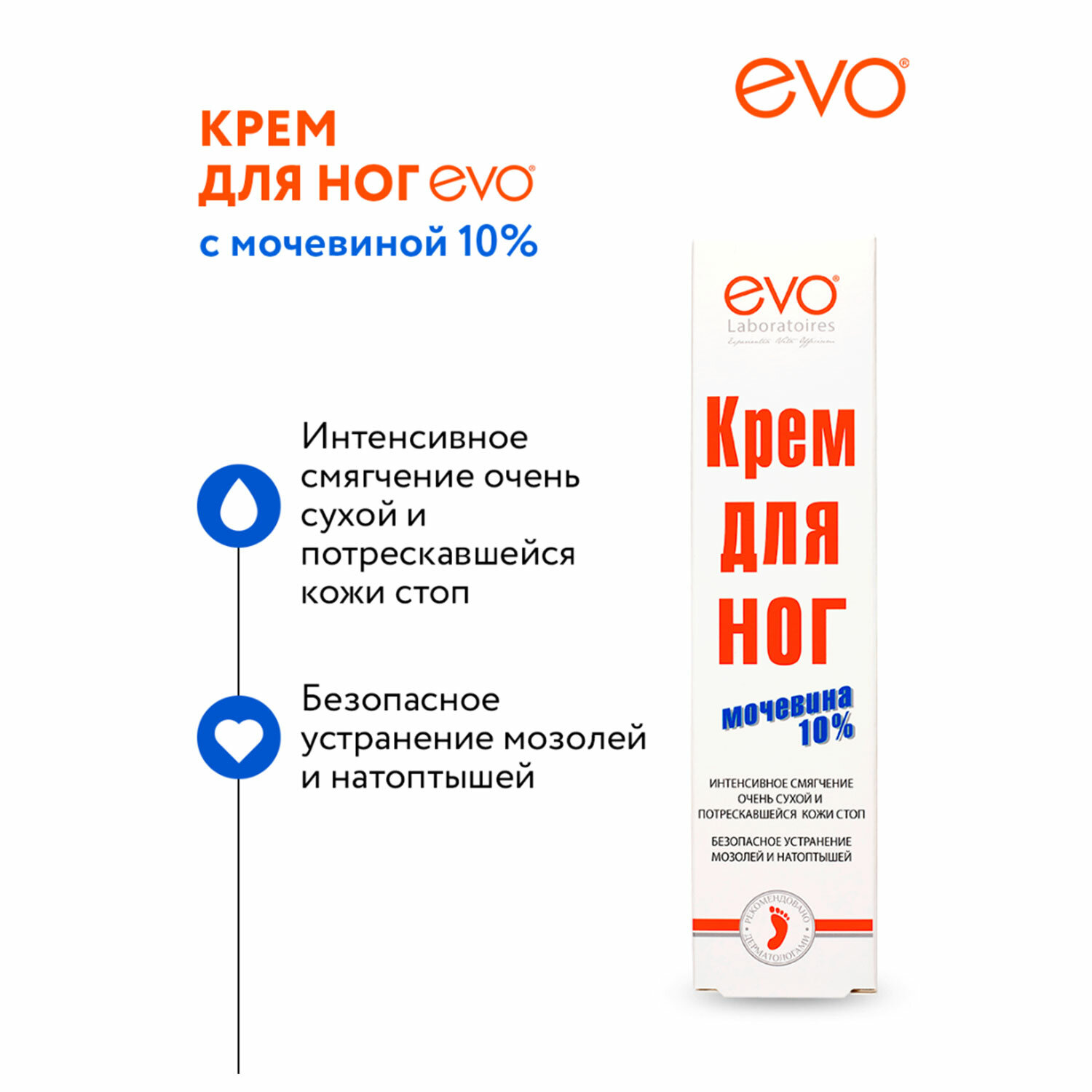 Крем для ног EVO с мочевиной 10% рекомендован для интенсивного смягчения очень сухой, огрубевшей и потрескавшейся кожи стоп; эффективного и безопасного устранения сухих мозолей и натоптышей за 5 дней применения; предотвращения грибковой микрофлоры и появления неприятного запаха.