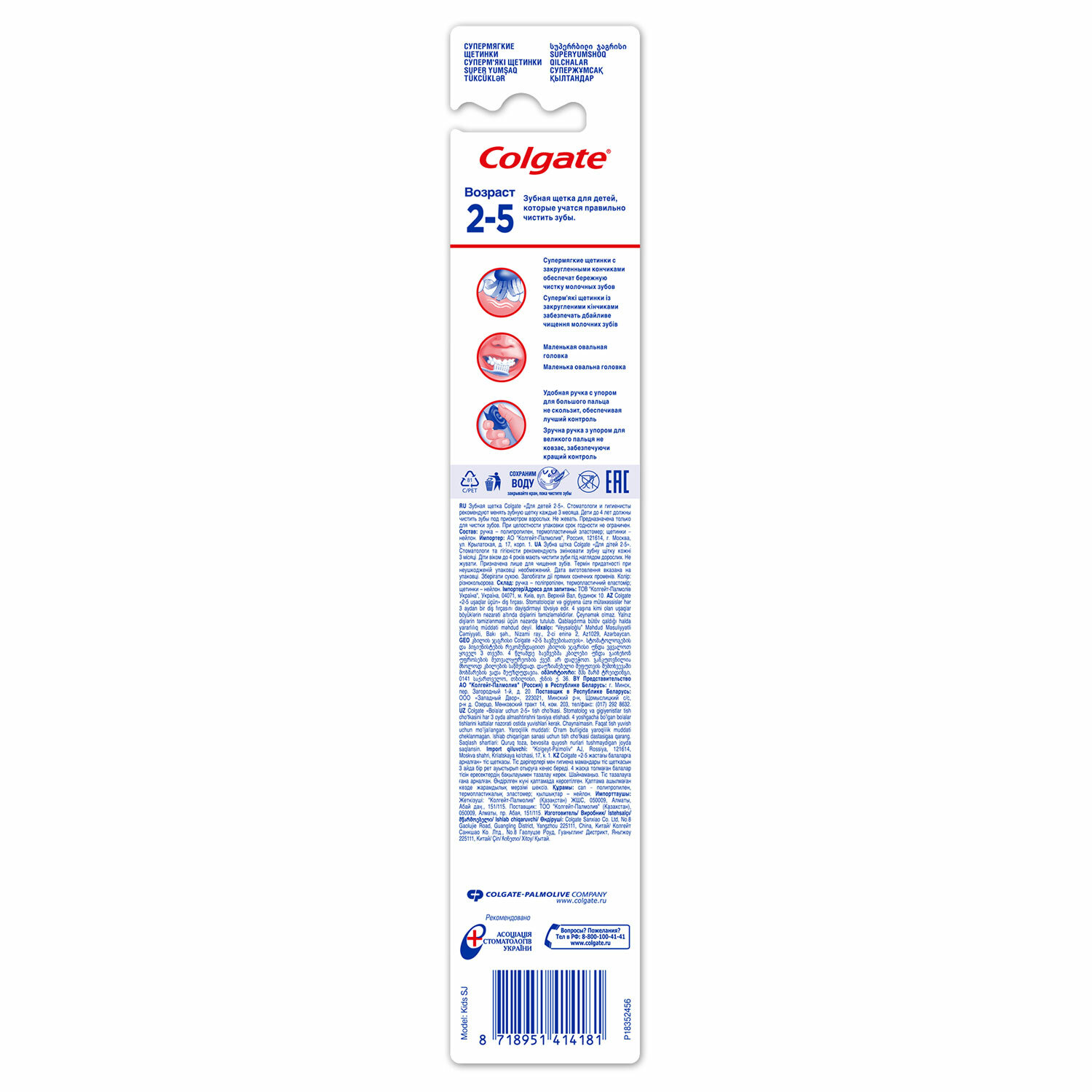 Ручка – полипропилен, термопластичный эластомер; щетинки – нейлон. Зубная щетка детская (2-5 лет) COLGATE, супер мягкая, 8718951414181