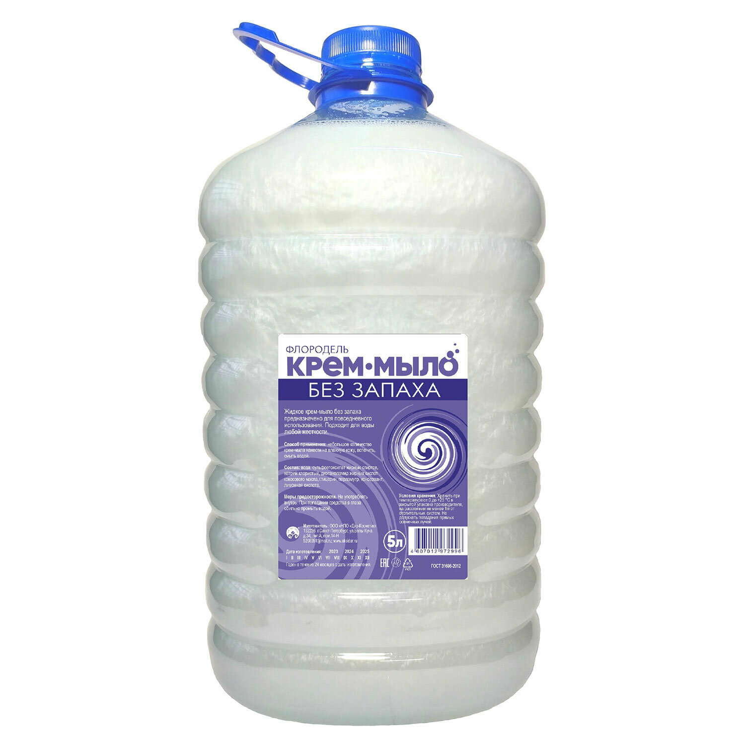 Состав: вода, сульфоэтоксилат жирных спиртов, натрий хлористый, диэтаноламид жирных кислот кокосового масла, глицерин, консервант, лимонная кислота (регулятор рН). Мыло-крем жидкое 5 л ФЛОРОДЕЛЬ "Мягкое", для повседневного использования, ПЭТ, 2996