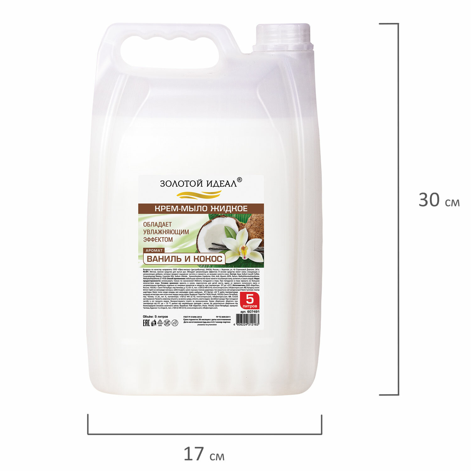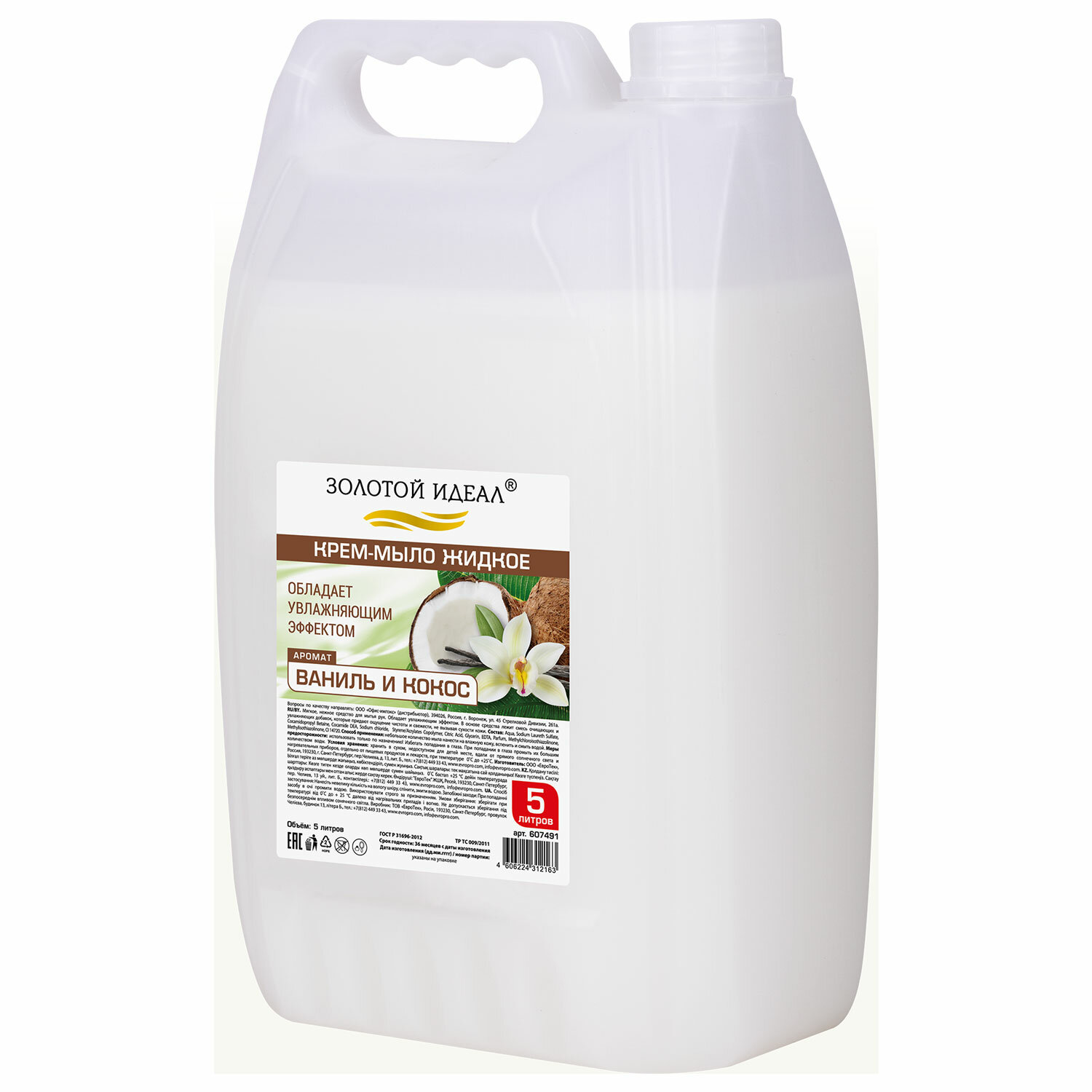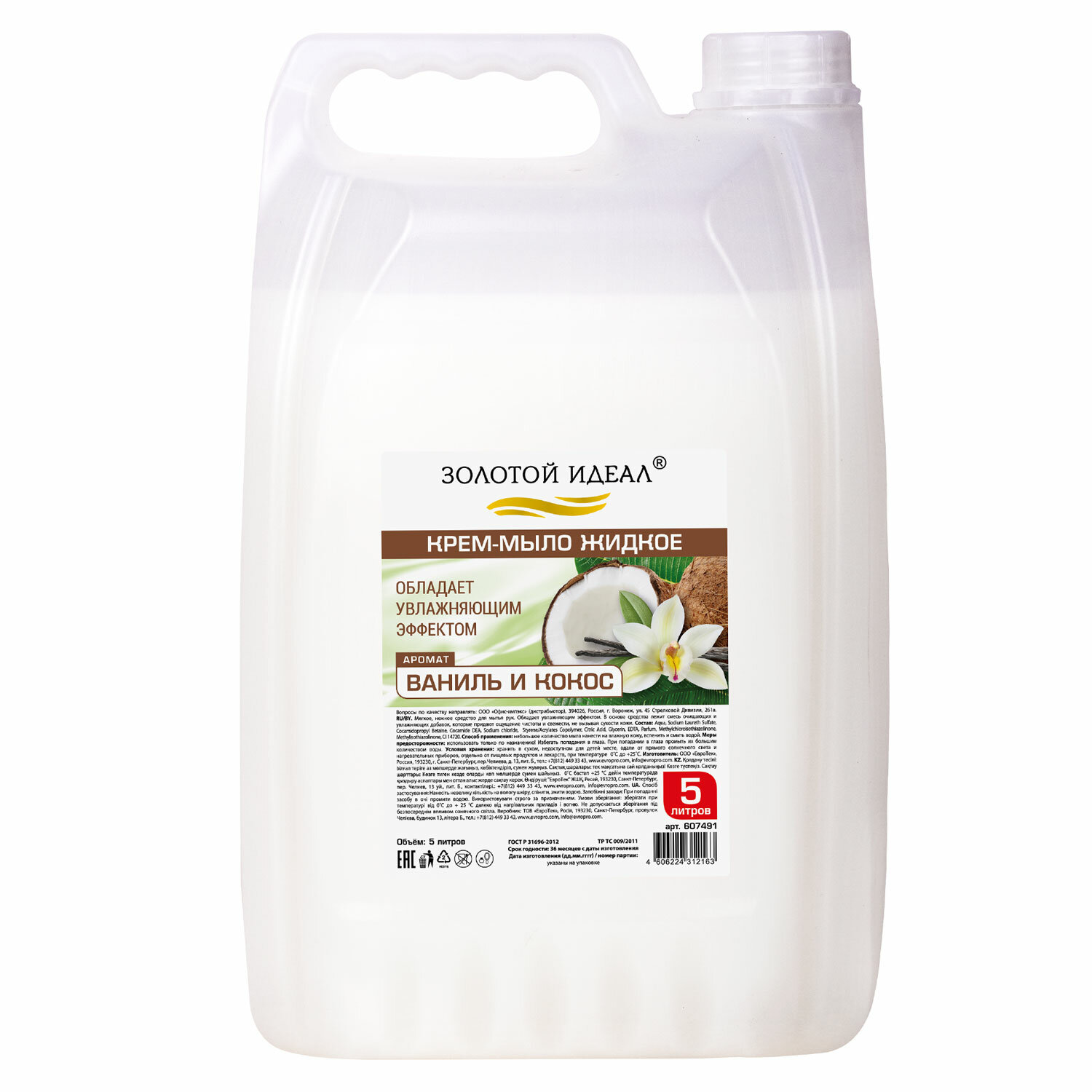 Соответствует ГОСТ Р 31696-2012. Мыло-крем жидкое, 5 л, ЗОЛОТОЙ ИДЕАЛ "Ваниль и кокос", 607491