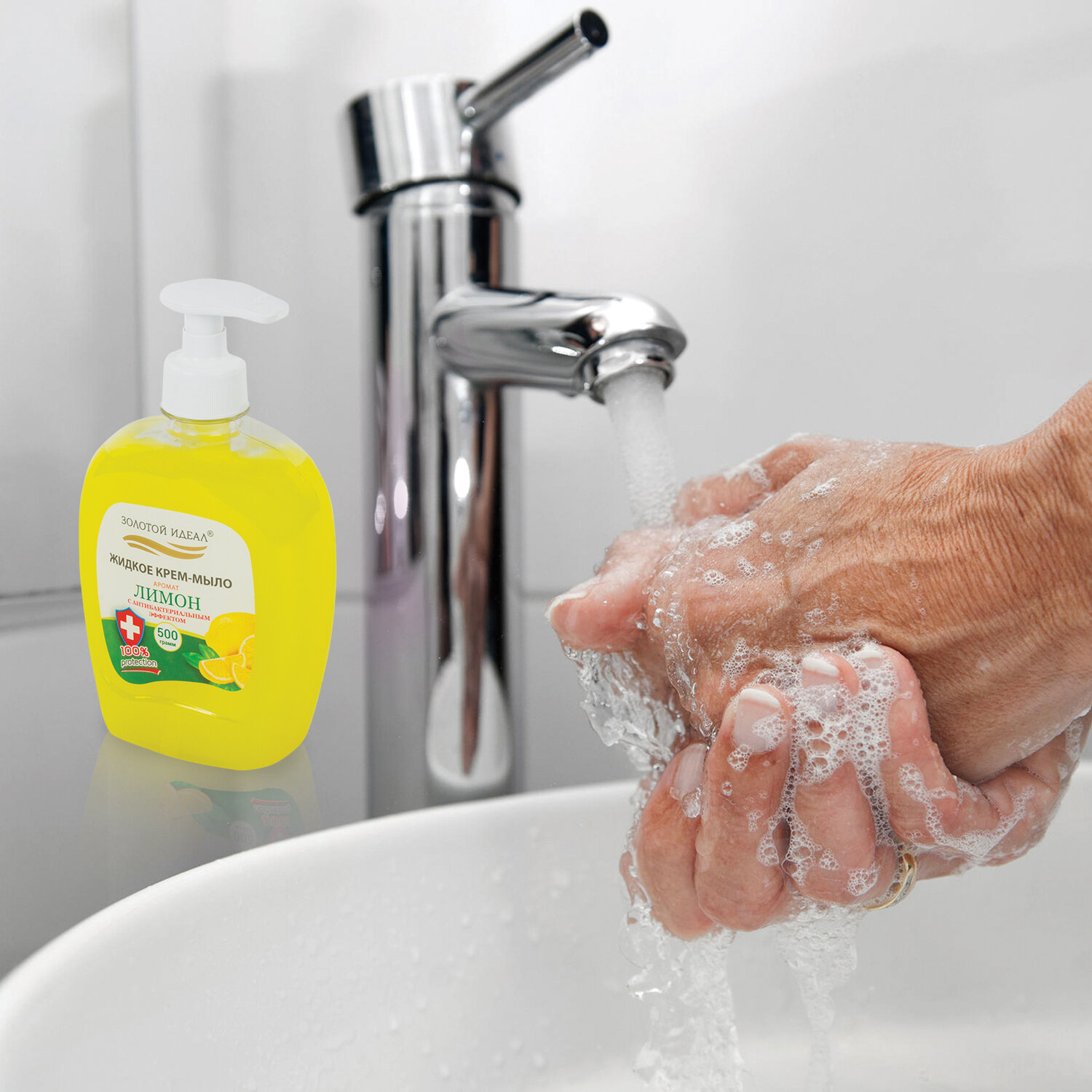 - Мыло-крем жидкое 500 г ЗОЛОТОЙ ИДЕАЛ "Лимон", с антибактериальным эффектом, дозатор, 606786