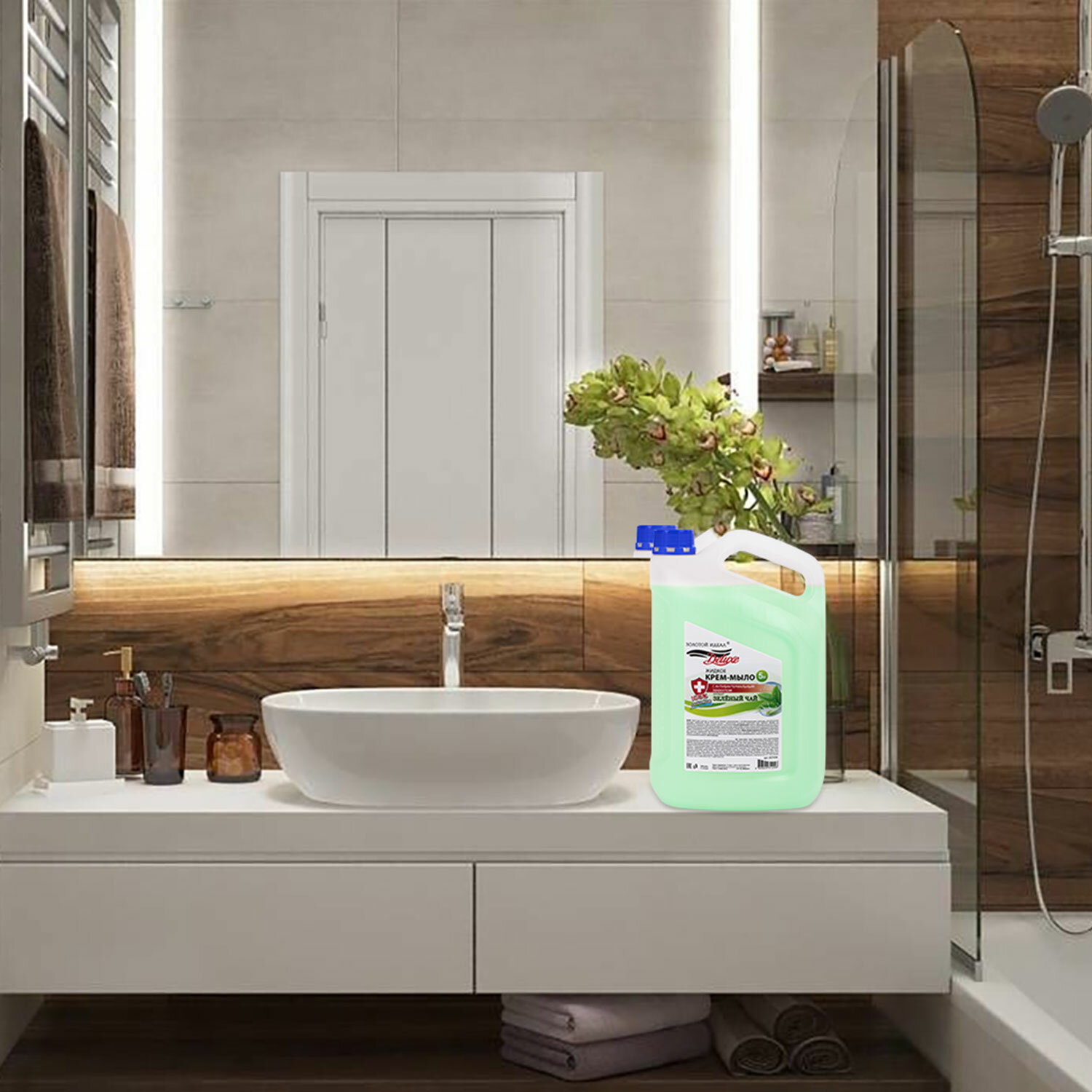 - Мыло-крем жидкое c АНТИБАКТЕРИАЛЬНЫМ ЭФФЕКТОМ, 5 л, ЗОЛОТОЙ ИДЕАЛ DELUXE "Зеленый чай", перламутровое, 607499
