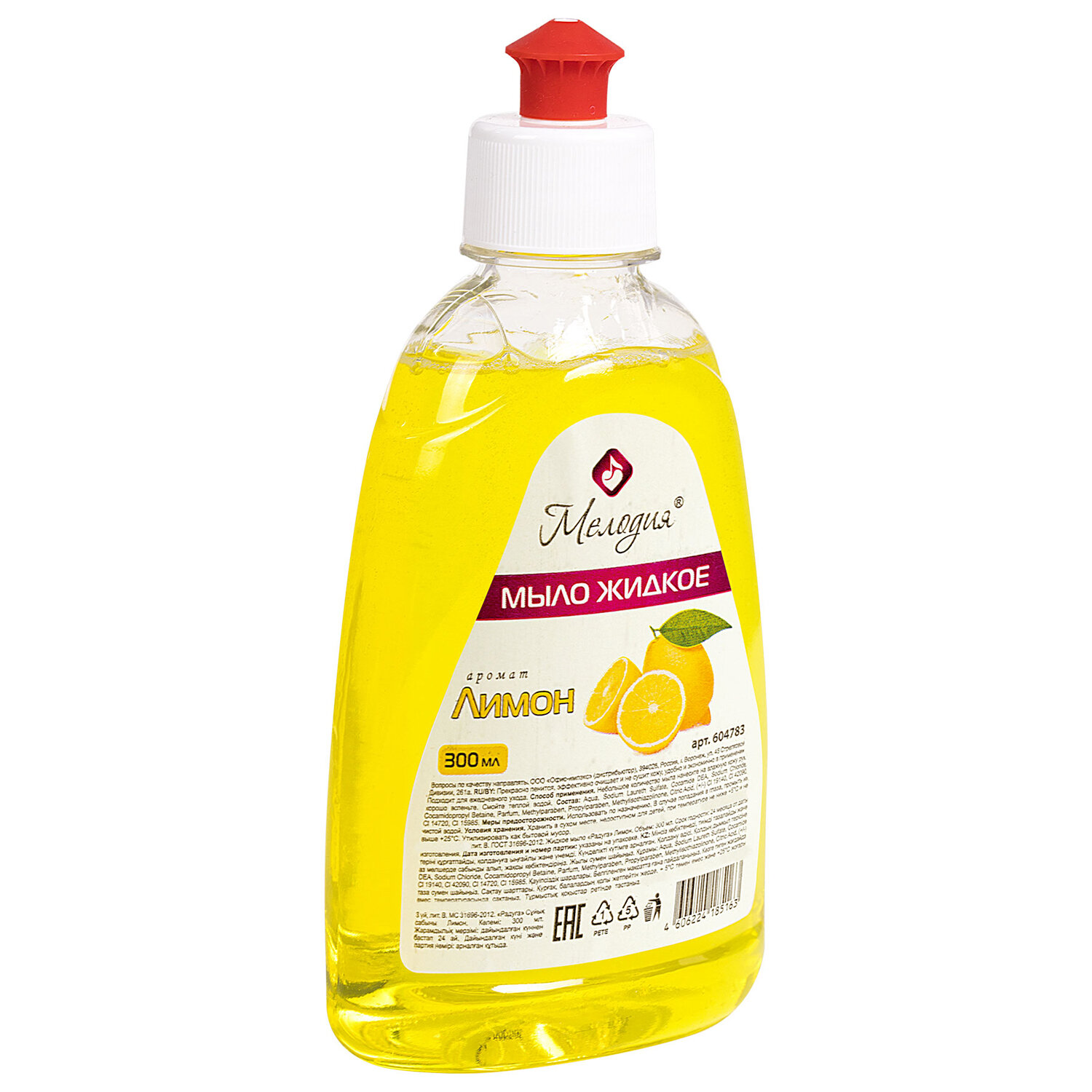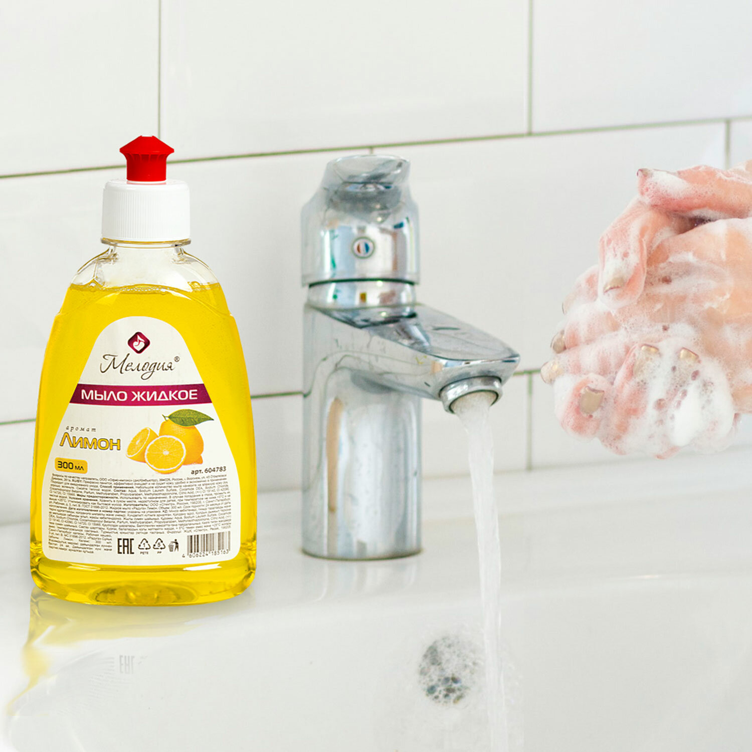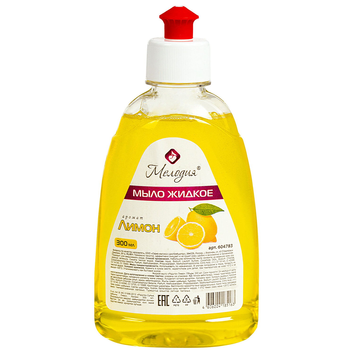 Это товар эконом-сегмента, поэтому он отличается привлекательной ценой. Товар обладает базовым набором характеристик и простой упаковкой, при этом полностью соответствует основным требованиям потребителей. Мыло жидкое 300 мл, МЕЛОДИЯ "Лимон", пуш-пул, 604783