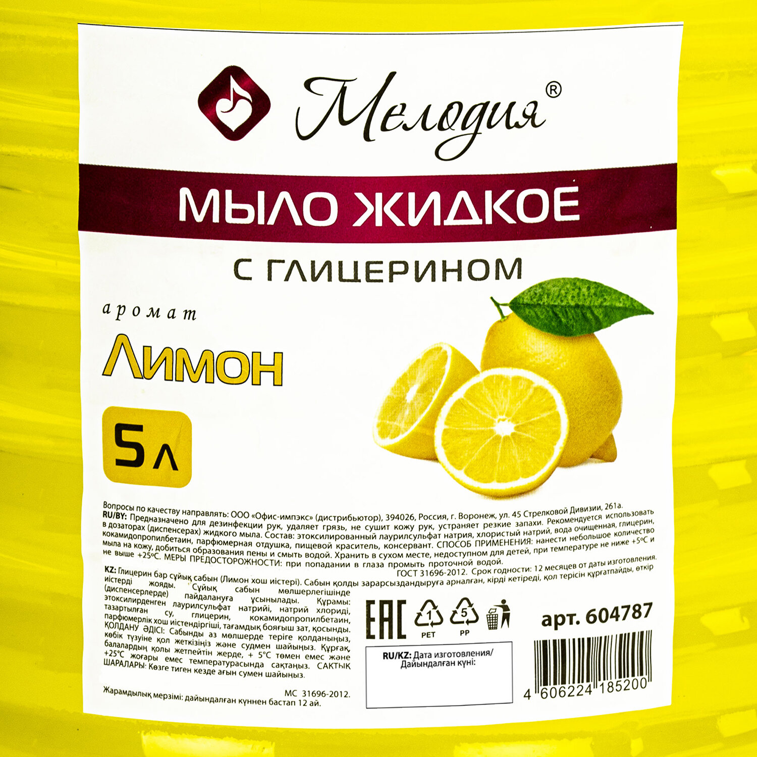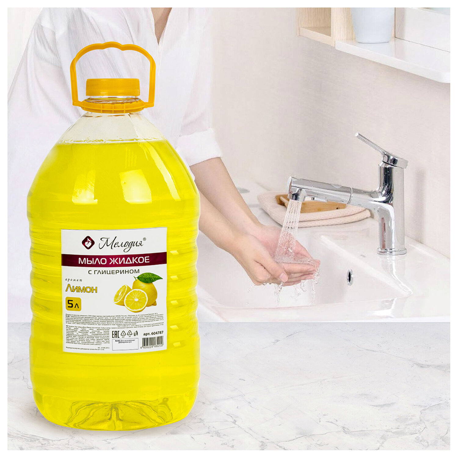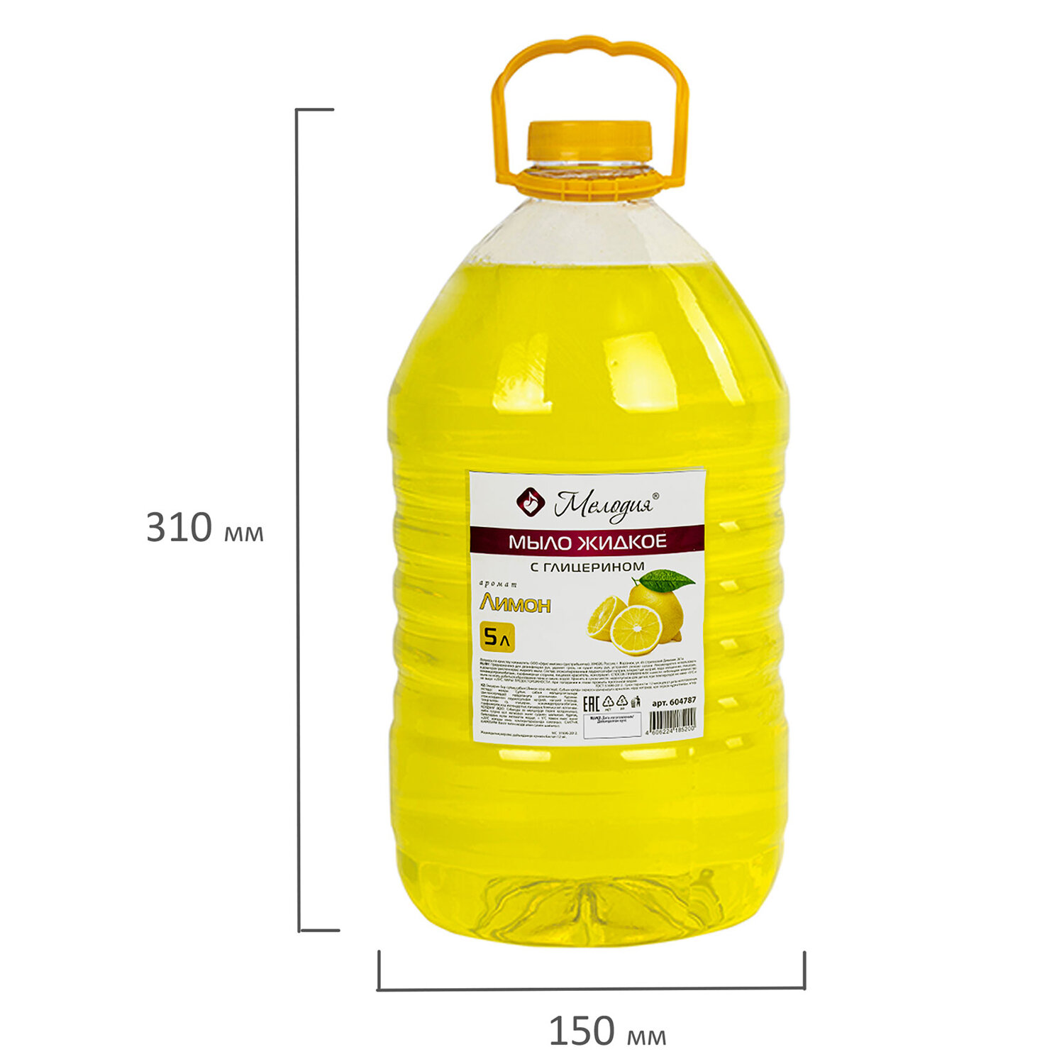 - Мыло жидкое 5 л, МЕЛОДИЯ "Лимон", с глицерином, ПЭТ, 604787