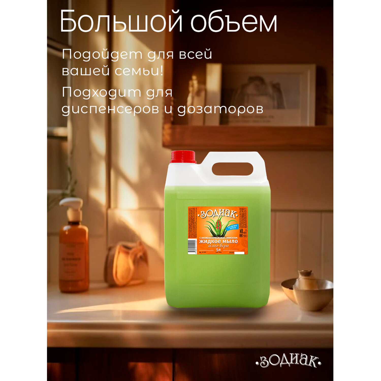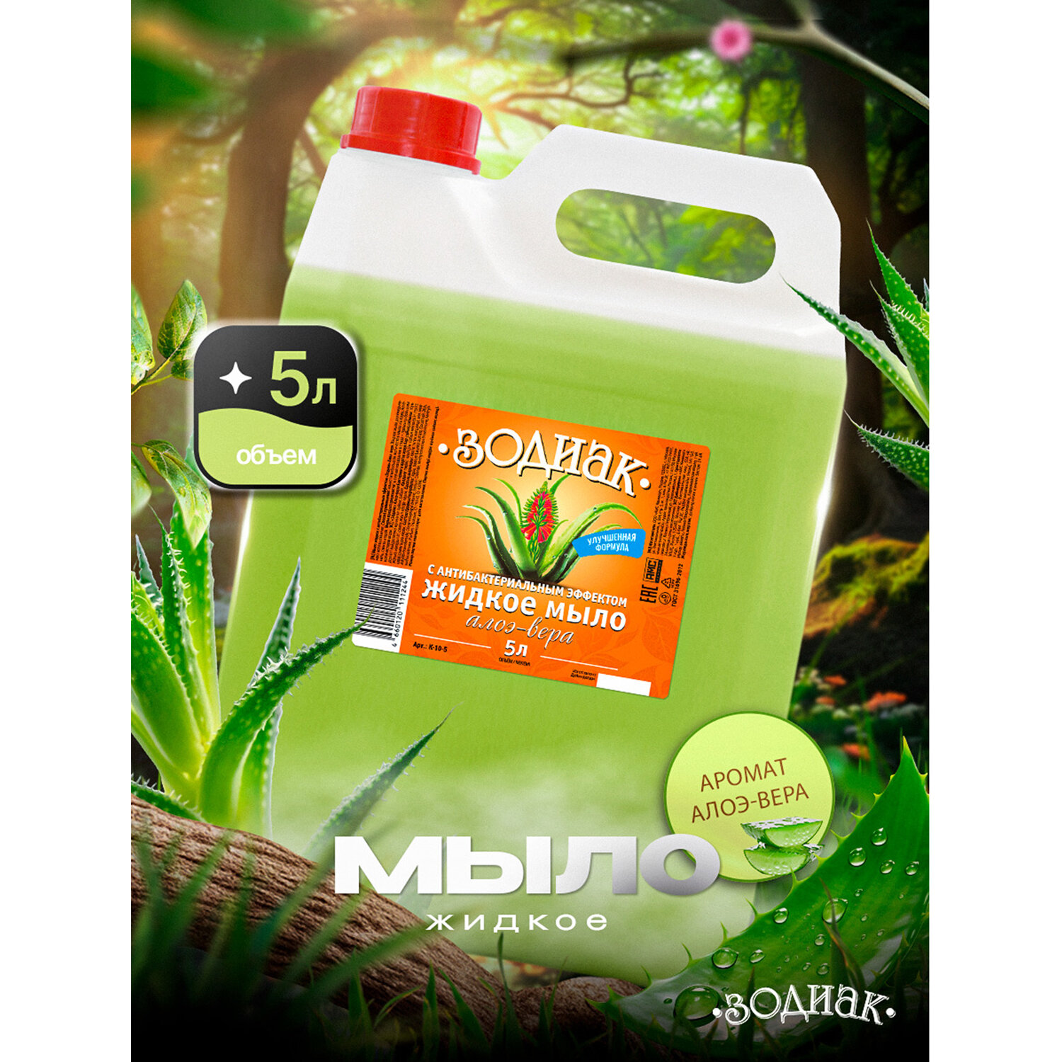 - Мыло жидкое 5 л, ЗОДИАК, антибактериальное, "Алоэ-вера", К10-5