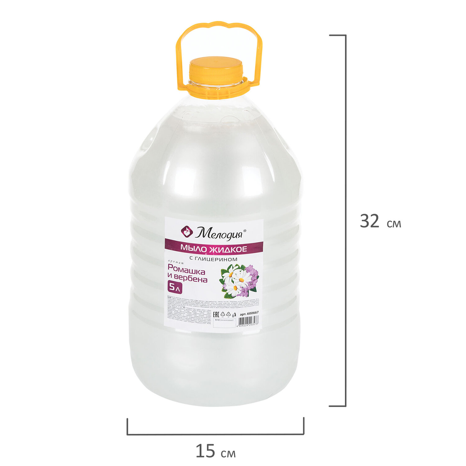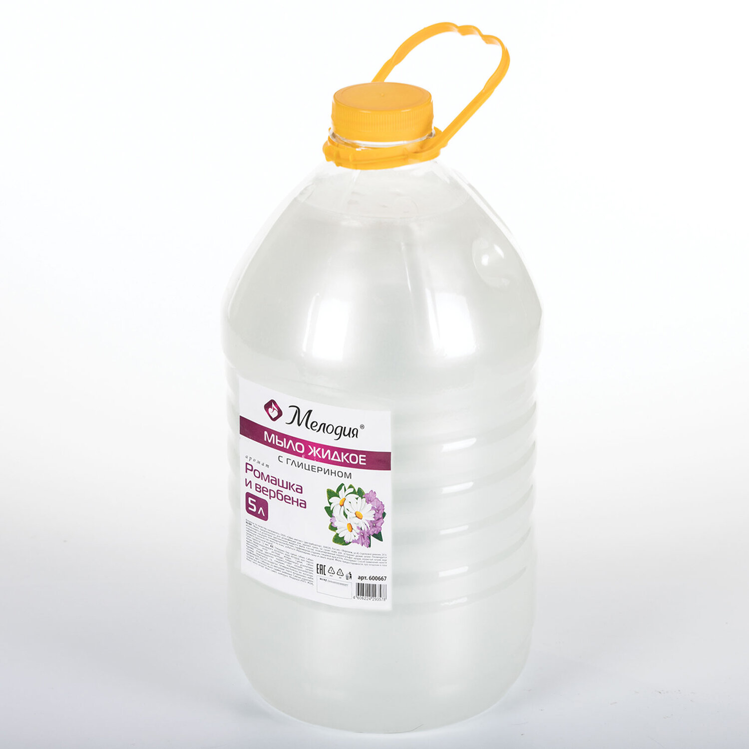 Это товар эконом-сегмента, поэтому он отличается привлекательной ценой. Товар обладает базовым набором характеристик и простой упаковкой, при этом полностью соответствует основным требованиям потребителей. Мыло жидкое 5л МЕЛОДИЯ "Ромашка и вербена", ПЭТ, 600667