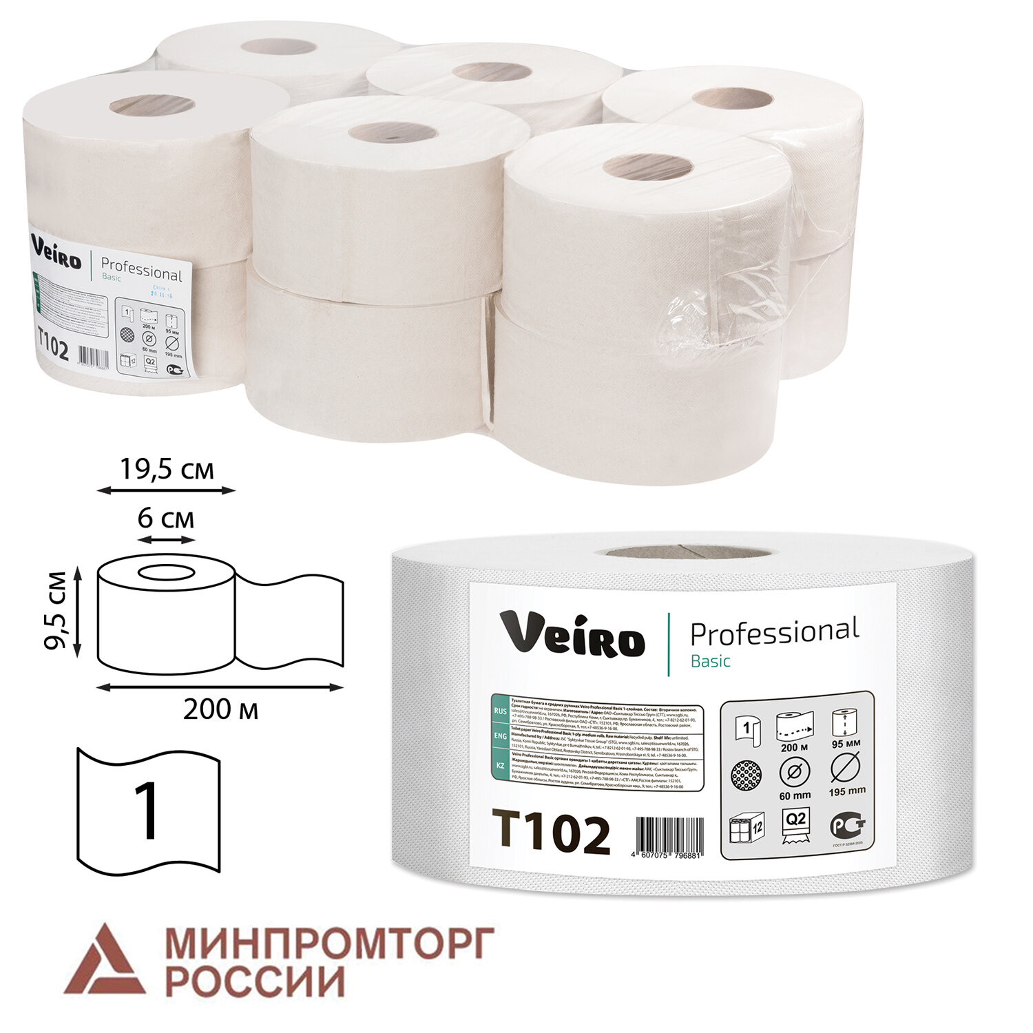 - Бумага туалетная 200 м, VEIRO Professional (Система T2), КОМПЛЕКТ 12 шт., Basic, T102