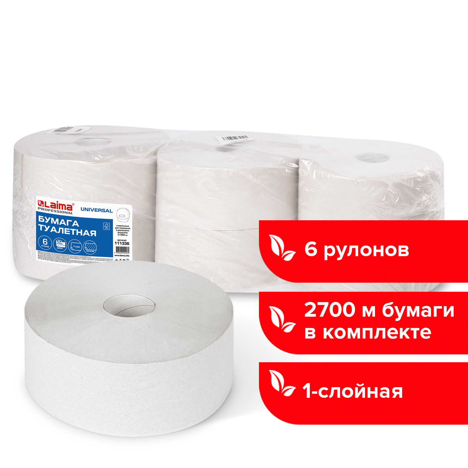 - Бумага туалетная БОЛЬШОЙ РУЛОН, 450 м, LAIMA (T1), UNIVERSAL, 1-слойная, КОМПЛЕКТ 6 рулонов, 111336