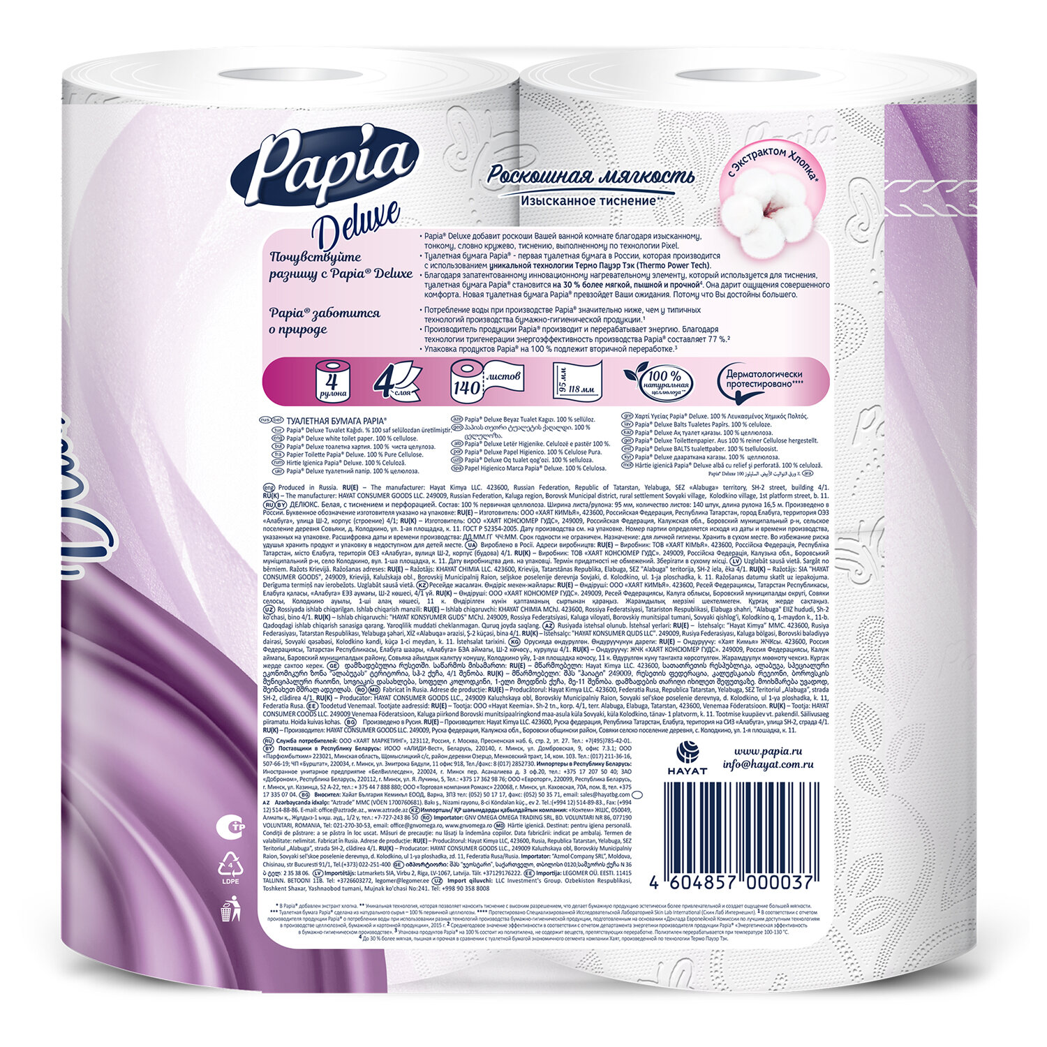 Белая четырёхслойная туалетная бумага в рулонах. Нежная текстура с инновационным тиснением и декоративный рисунок придают бумаге особую мягкость и обеспечивают бережный уход за кожей. Бумага туалетная быт., спайка 4 шт., 4-слойная (4х16 м), PAPIA DELUXE, белая, 5080736