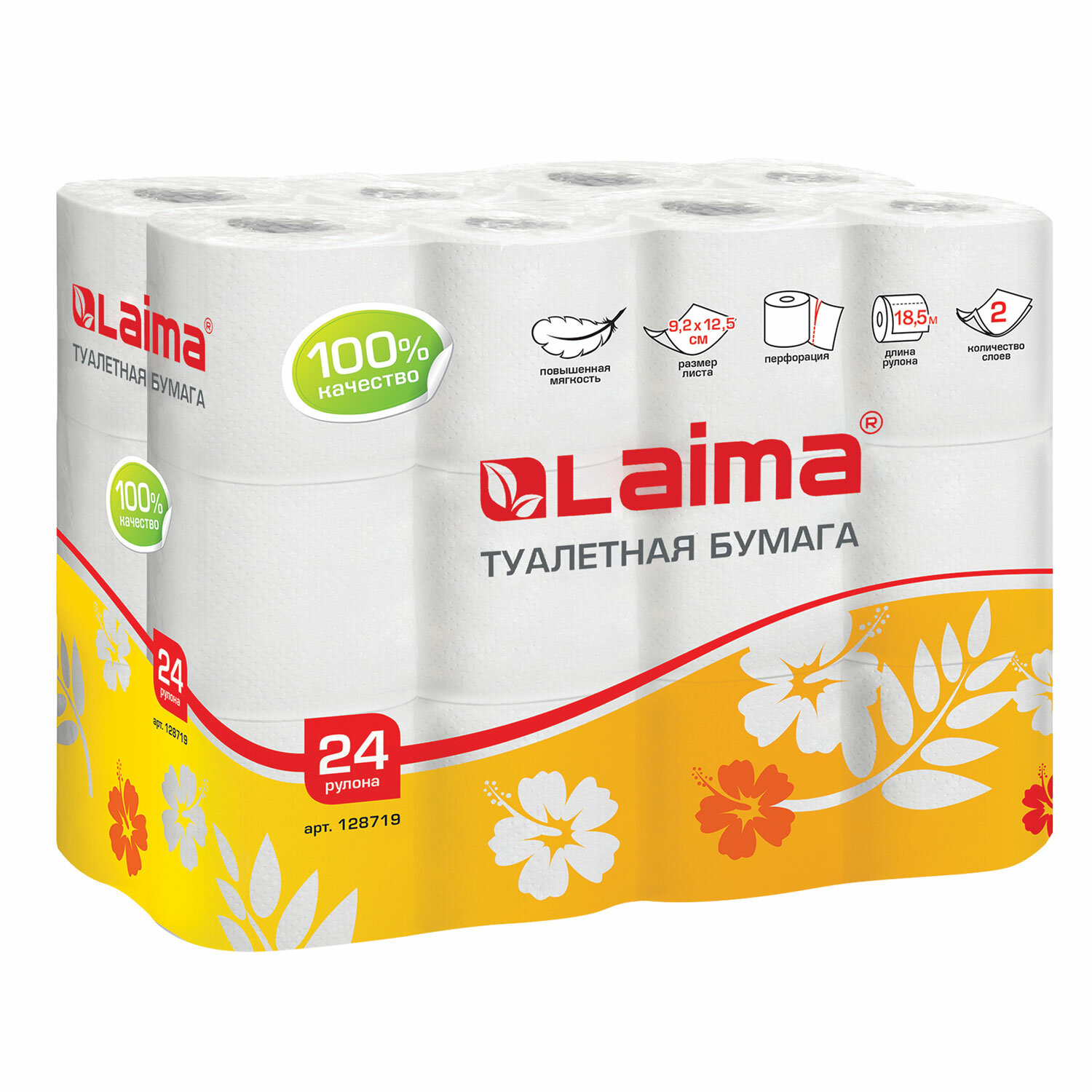 - Бумага туалетная бытовая, спайка 24 шт., 2-х слойная, (24х18,5 м), LAIMA, белая, 128719