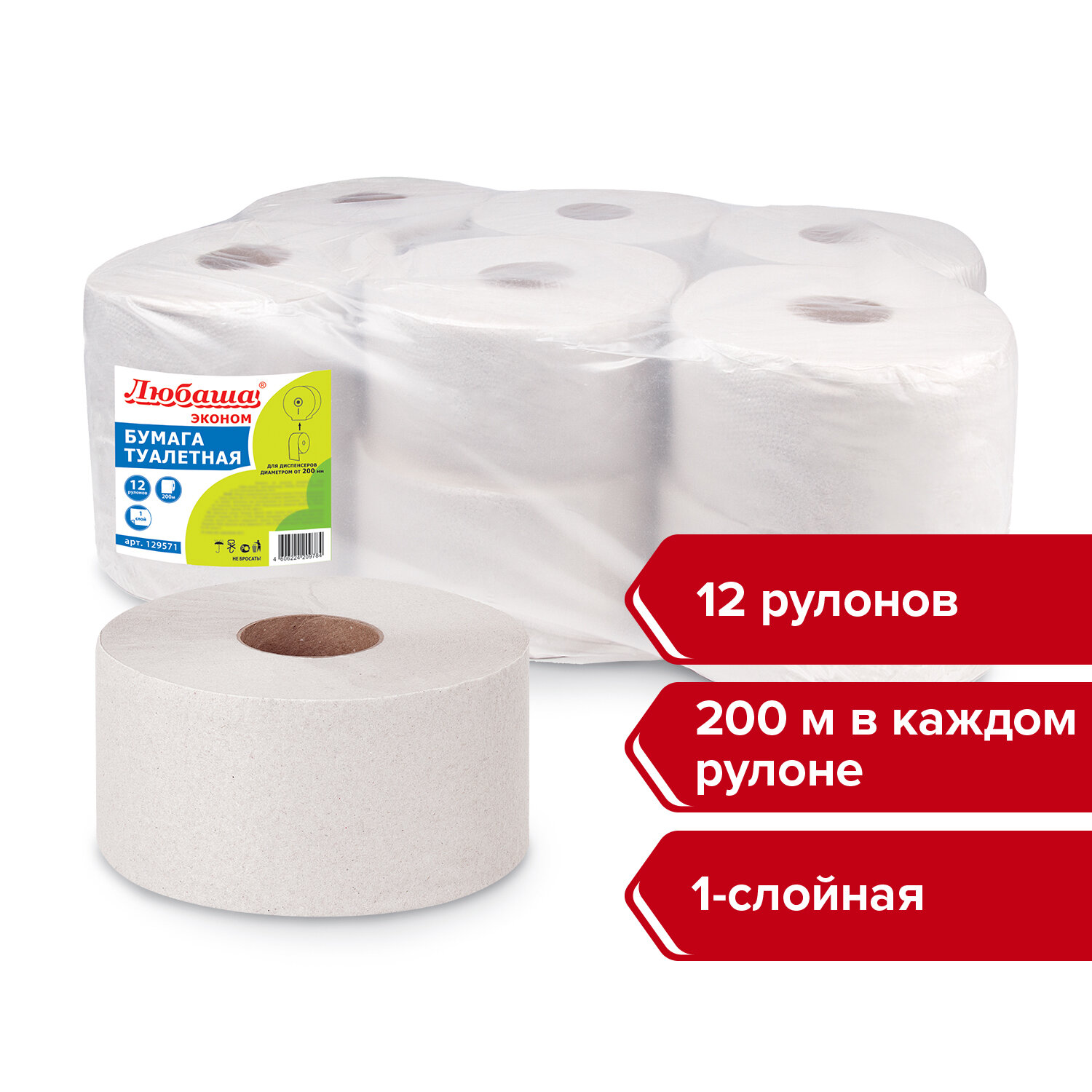 Это товар эконом-сегмента, поэтому он отличается привлекательной ценой. Товар обладает базовым набором характеристик и простой упаковкой, при этом полностью соответствует основным требованиям потребителей. Бумага туалетная ЛЮБАША (Система T2) 1-слойная 12 рулонов по 200 метров, цвет серый, 129571, 129571 (МП-39)