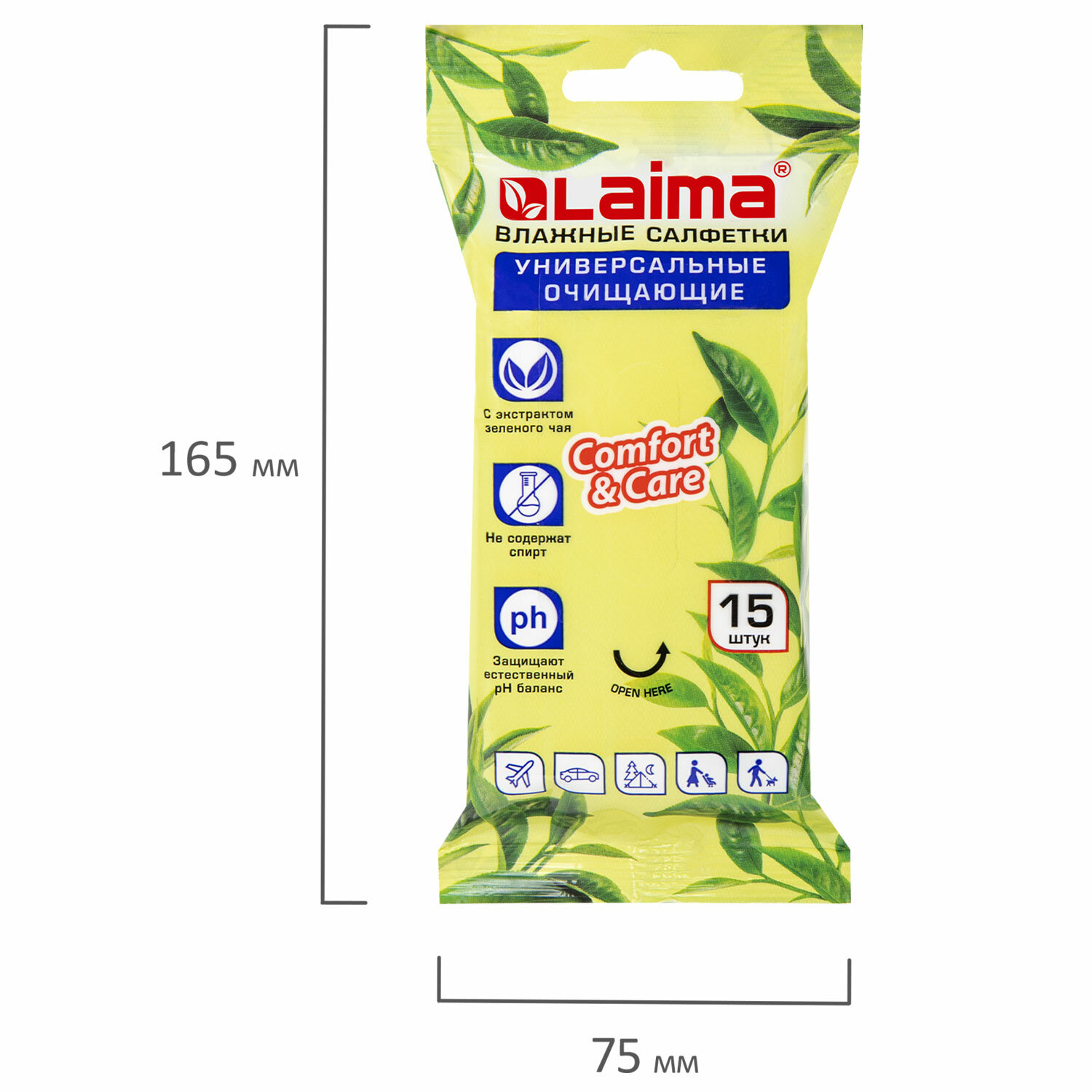 - Салфетки влажные 15 шт., УНИВЕРСАЛЬНЫЕ, очищающие, с экстрактом зеленого чая, LAIMA, 125956