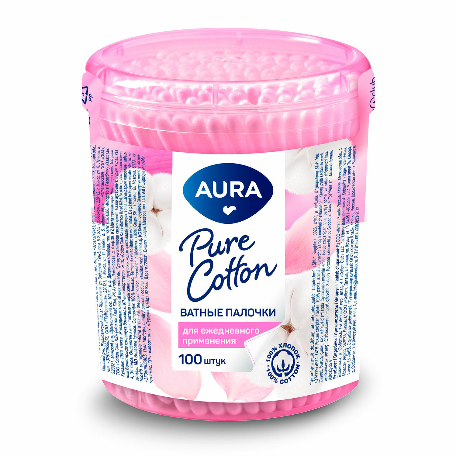 - Ватные палочки КОМПЛЕКТ 100 шт., AURA, пластиковый стакан, 13143