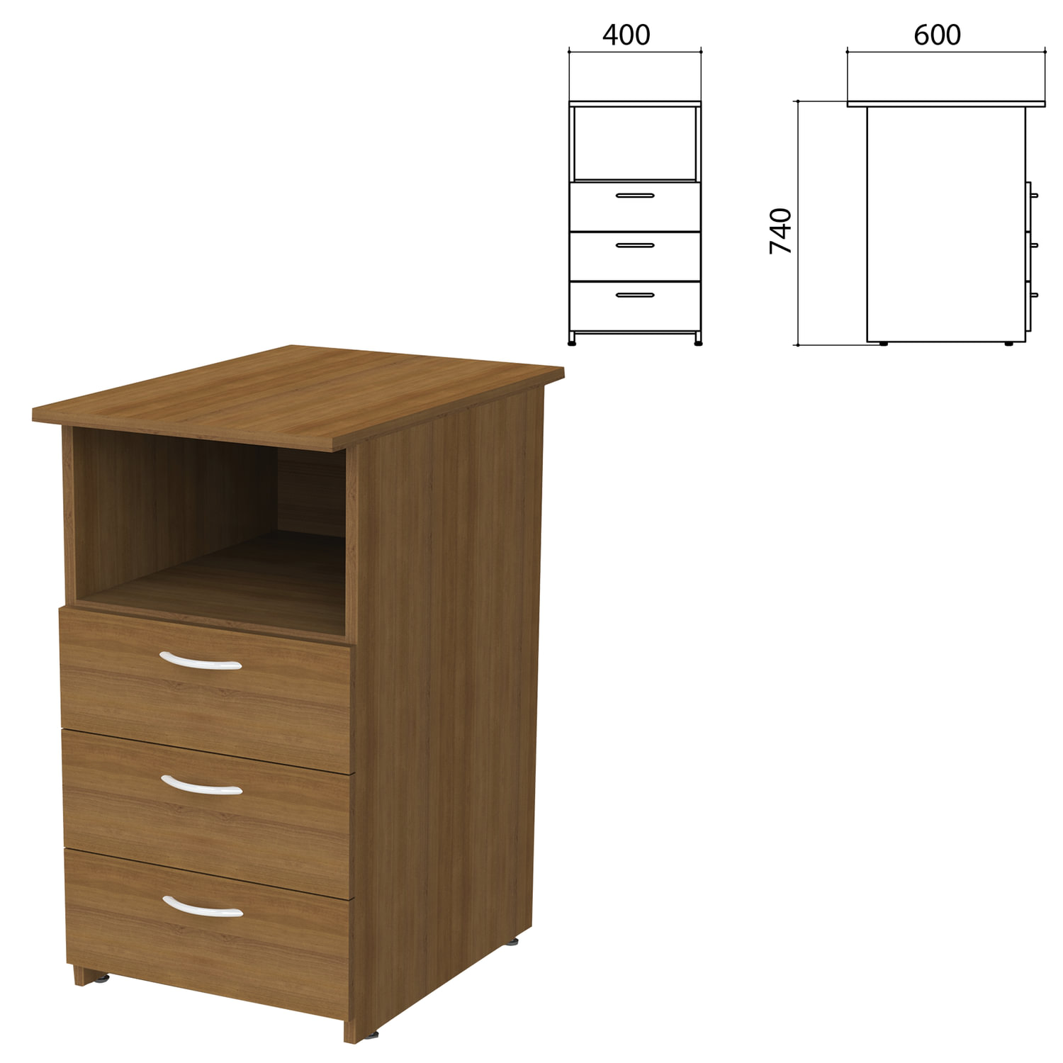 Тумба приставная "Бюджет", 400х600х740 мм, 3 ящика, полка, орех французский, 402657-190