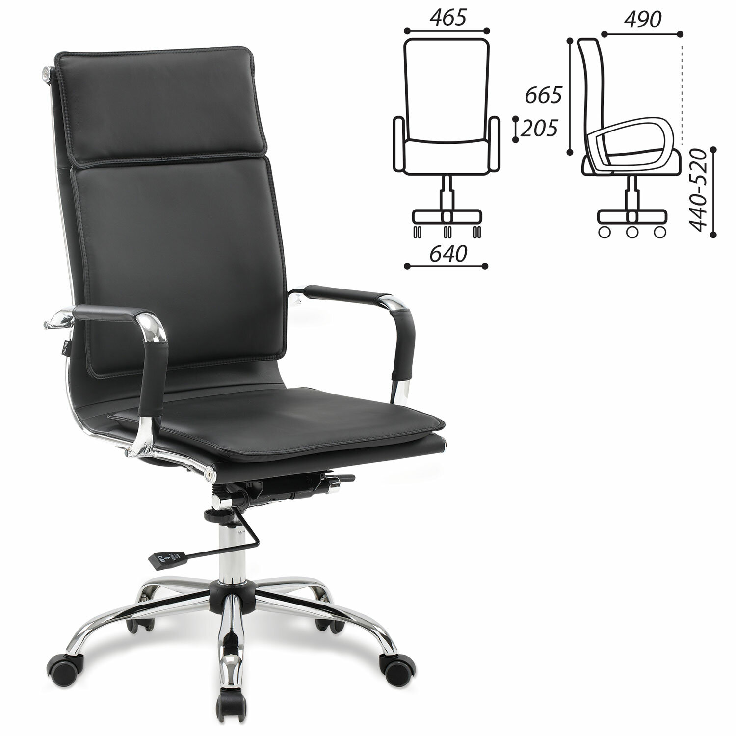 Конструкция кресла отвечает всем нормам современной эргономики: высокая спинка, упругая набивка и хромированные подлокотники с противоскользящими накладками. Всё это обеспечит необходимым комфортом пользователя.
