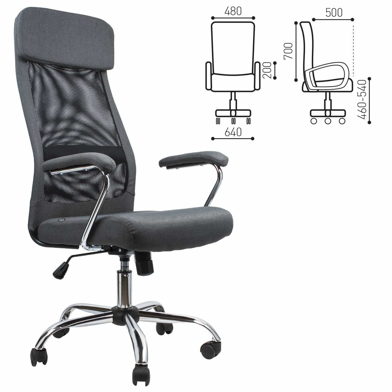 - Кресло офисное BRABIX "Flight EX-540", хром, ткань, сетка, серое, 531848