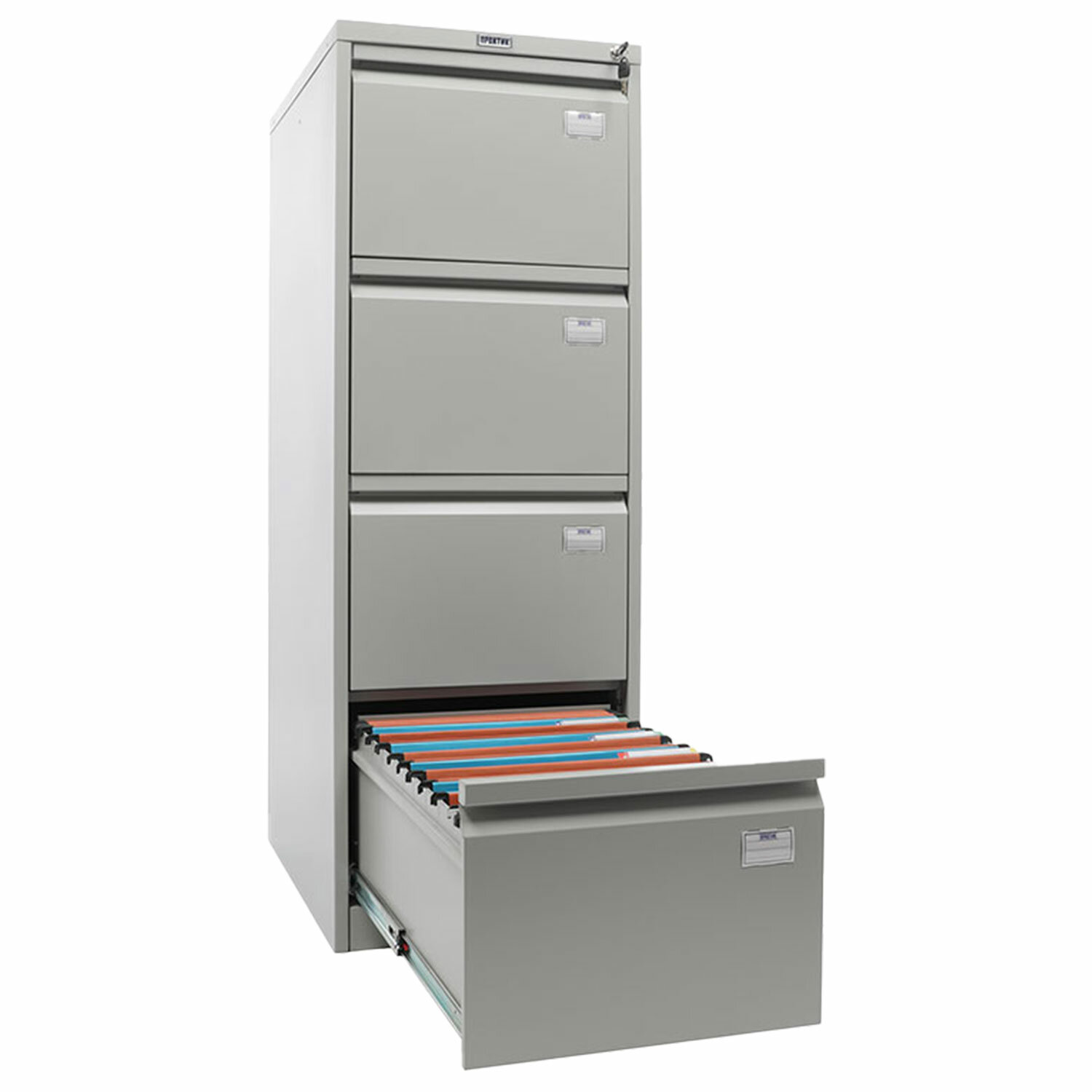 Телескопические направляющие обеспечивают плавный ход ящика даже при полной нагрузке. Снабжен 4 выдвигающимися ящиками, каждый из которых способен вместить до 55 подвесных папок-файлов. Общий объем хранения – 220 файлов. Максимальная допустимая нагрузка на ящик – 30 кг. Допустимо использование подвесных папок. Ключевой замок EuroLock ограничивает доступ посторонних к документам. Ящики снабжены информативными табличками.