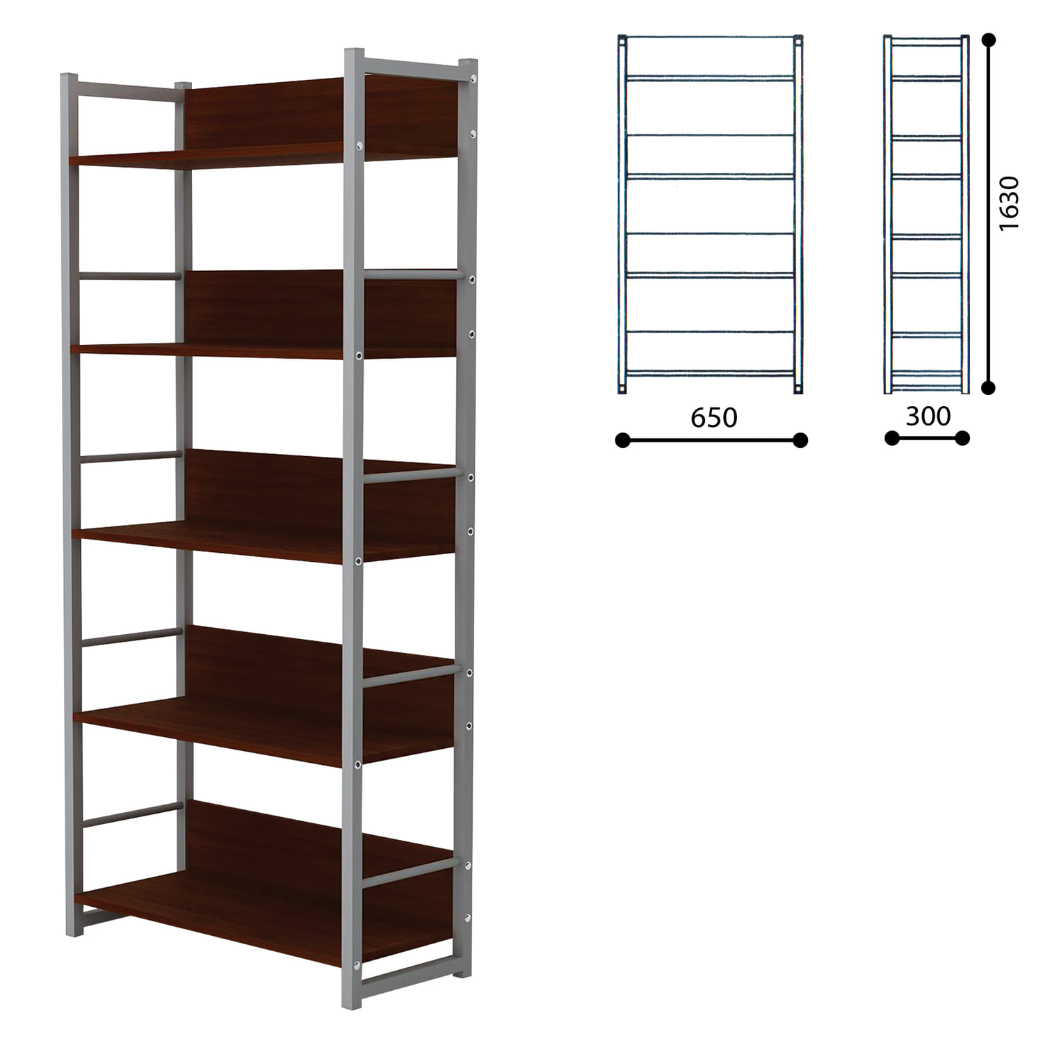 - Стеллаж на металлокаркасе, 1630х650х300 мм, серый каркас, 5 полок ЛДСП орех, Д-343
