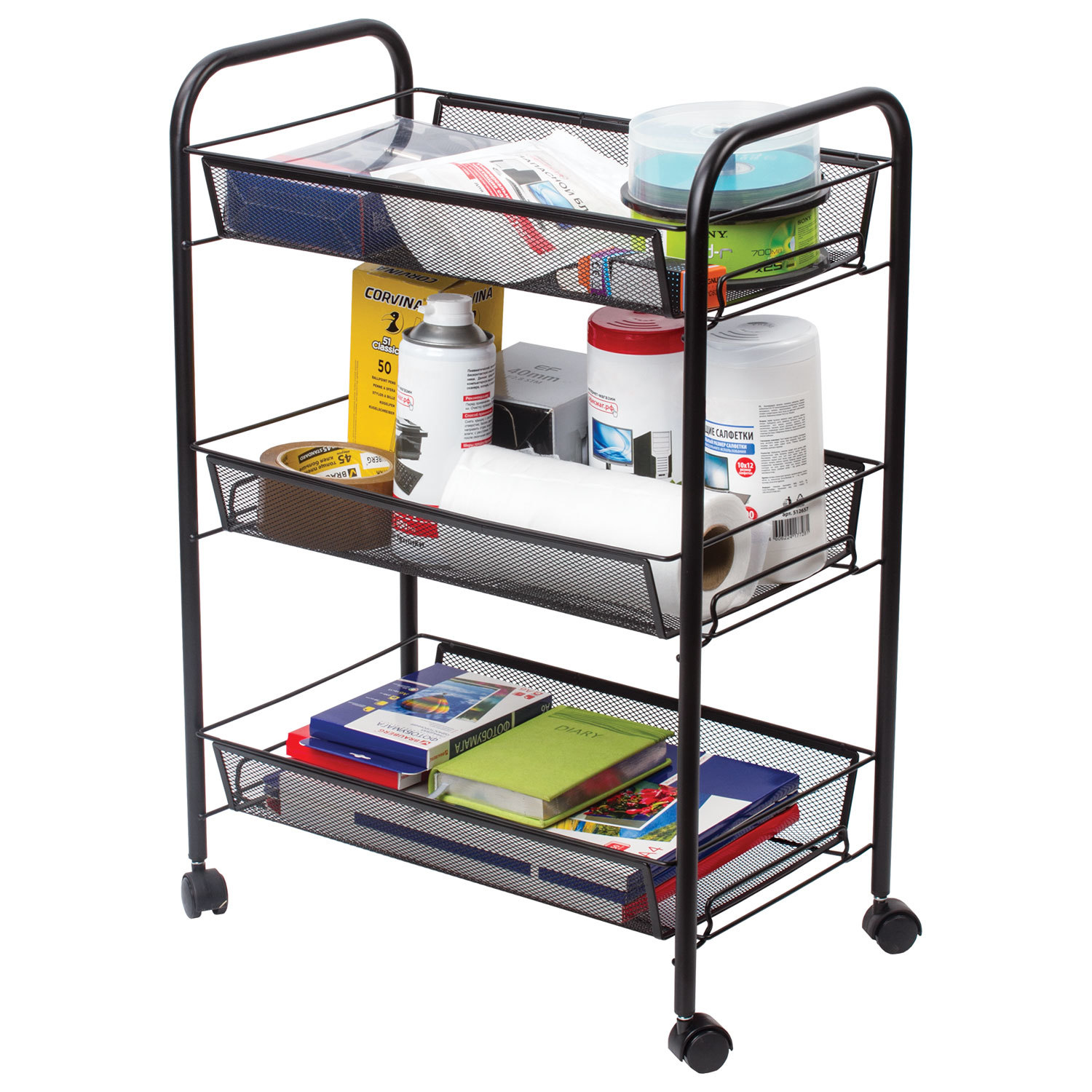 - Этажерка (тележка) BRABIX офисно-бытовая 3 яруса, на колесах, металл, черная, 43,5х26х62,5 см, 603751