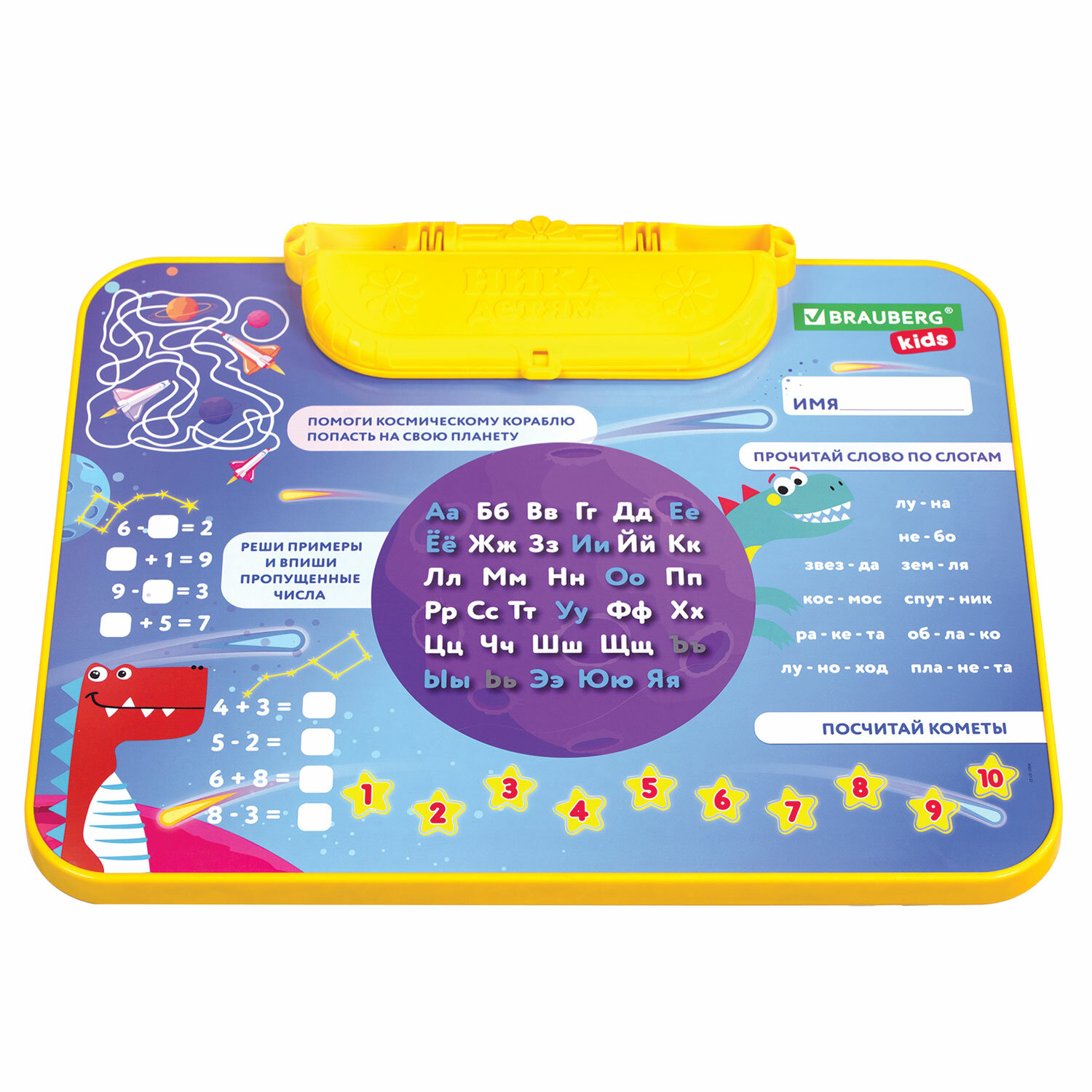 Комплект мебели (стол + стул) BRAUBERG NIKA KIDS предназначен для детей в возрасте от 3 до 7 лет. Изделие в сложенном виде упаковано в одну компактную картонную коробку. Столешница содержит русский алфавит и обучающие упражнения по арифметике и чтению. На столе можно рисовать маркером на водной основе. Размер стола - 60х45 см, высота до поверхности столешницы - 58 см. Стул имеет мягкое сиденье и спинку из ткани с водоотталкивающей пропиткой. Размер сиденья - 28,5х27 см. Стул выдерживает вес ребенка до 50 кг. Вместительный пенал для письменных принадлежностей. Удобный механизм складывания и компактное хранение. Есть крючок для рюкзака или ранца. Комплект детской мебели голубой КОСМОС: стол + стул, пенал, BRAUBERG NIKA KIDS, 532634