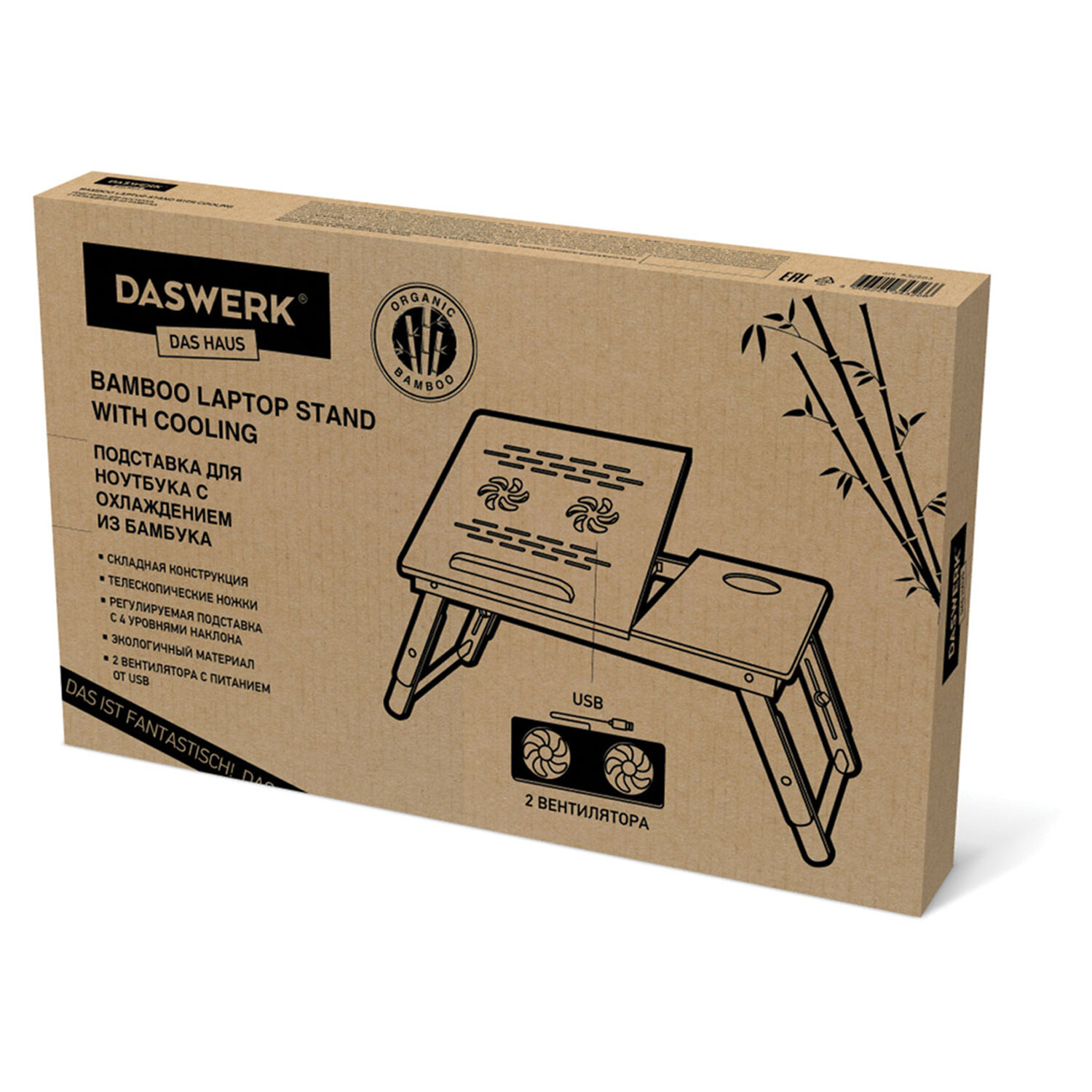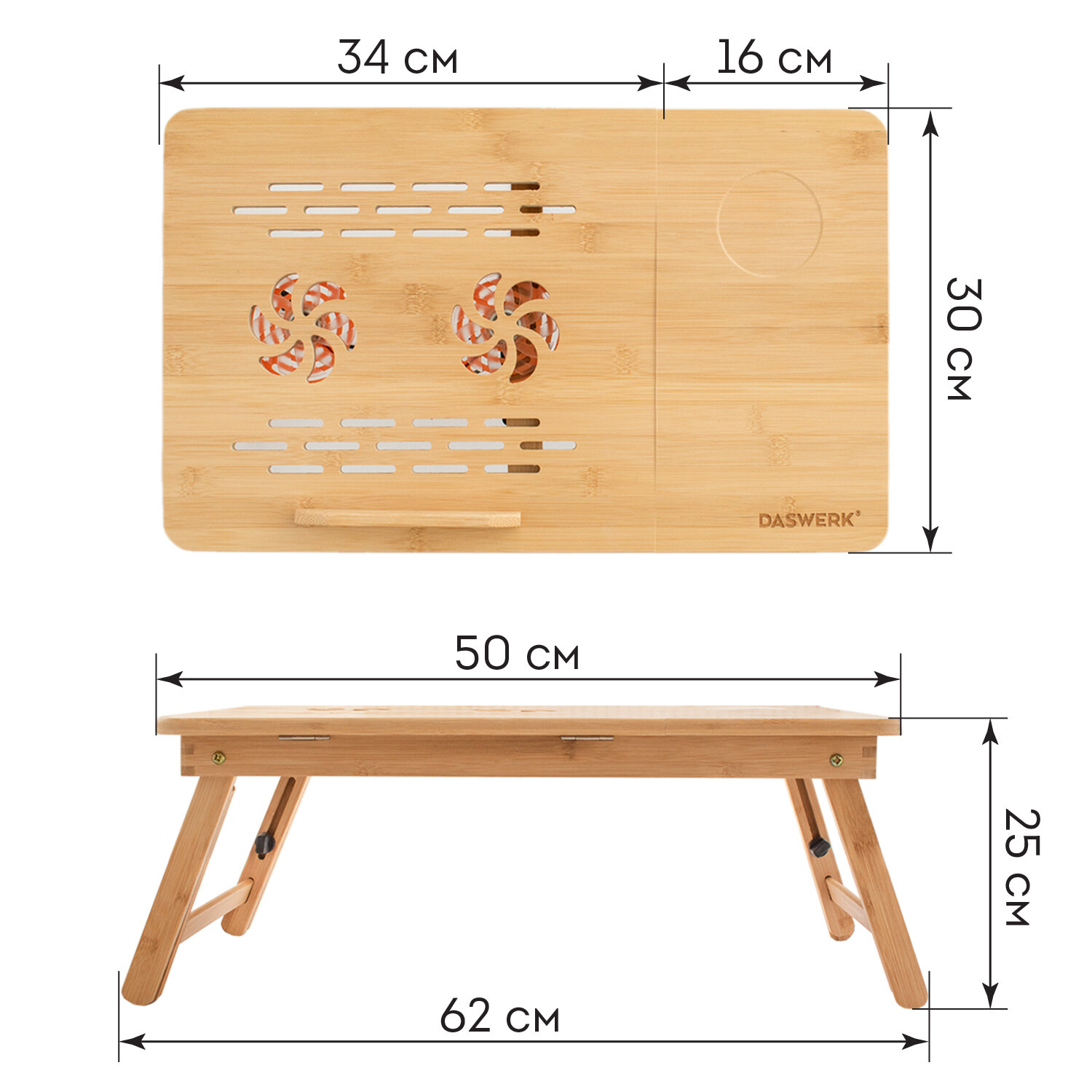 Важно: не храните вблизи отопительных приборов! Столик БАМБУКОВЫЙ складной для ноутбука/завтрака, с охлаждением, DASWERK, 532583