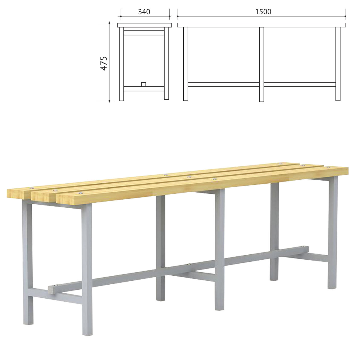 Каркас из металлической трубы серого цвета прямоугольного сечения размером 25х25 мм. Покрытие - полимерное, порошковое. Сиденье - доска из сосны толщиной 30 мм, покрыто прозрачным лаком с антисептиком. Размеры (ШхГхВ) - 1500х340х475 мм. Фурнитура и инструкция по сборке - в комплекте.