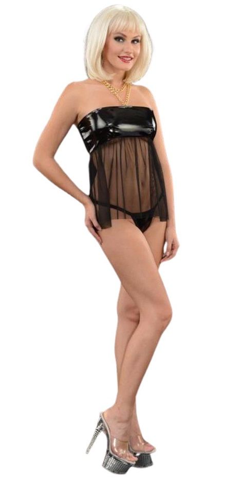 Стильный соблазнительный черный комплект из сорочки с блестящим гладким лифом. В комплекте трусики-стринги с золотой цепочкой сзади. В комплекте: сорочка, трусики-стринги. Оригинальная сорочка с wet-look лифом