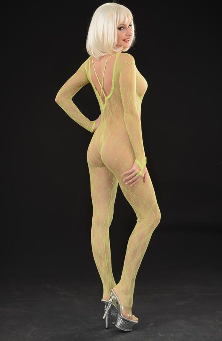 Яркий костюм-кэтсьюит из ажурной тянущейся сетки. V-образный вырез, длинные рукава и петелька на пальце. Яркий кэтсьюит из ажурной тянущейся сетки
