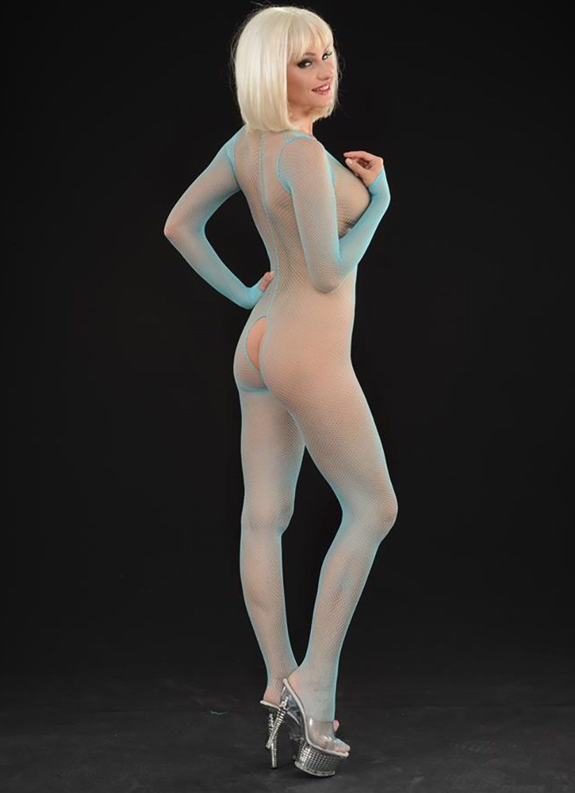 Комбинезон-кэтсьюит на все тело, из мелкой сетки. Спереди глубокий вырез ниже пупка. Зона бикини открыта. Длинные рукава с петлей на палец. Женский кэтсьюит из мелкой сетки с глубоким вырезом